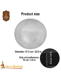 Realizzato artigianalmente in acciaio dolce calibro 20, questo scudo si distingue non solo per la sua robustezza, ma anche per la sua finitura lucida, che gli conferisce un aspetto impeccabile degno di ammirazione. Con un peso di 2,6 kg, offre un perfetto equilibrio tra protezione e manovrabilità, ideale sia per l'esposizione che per la rievocazione storica.
