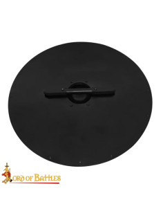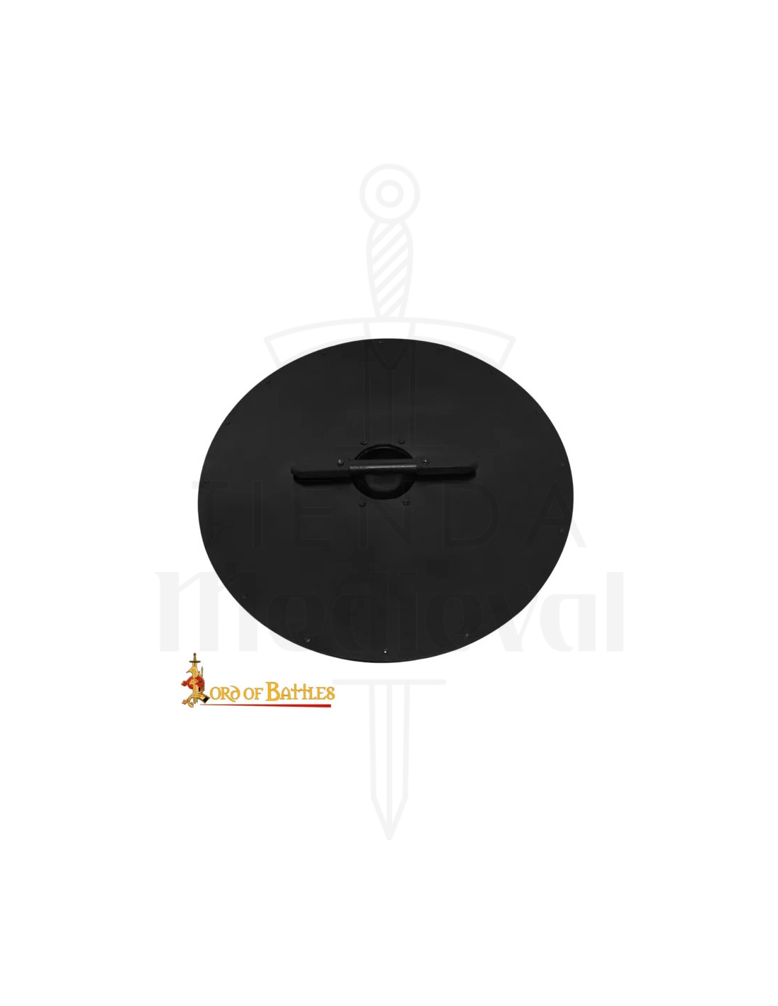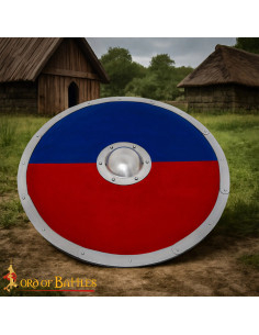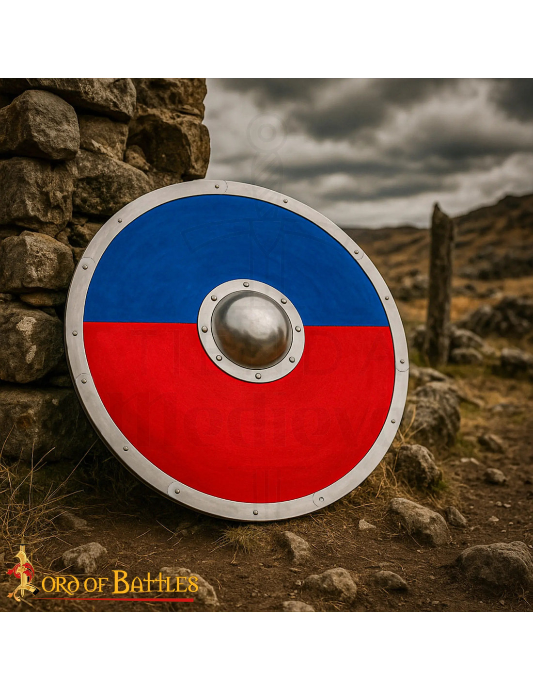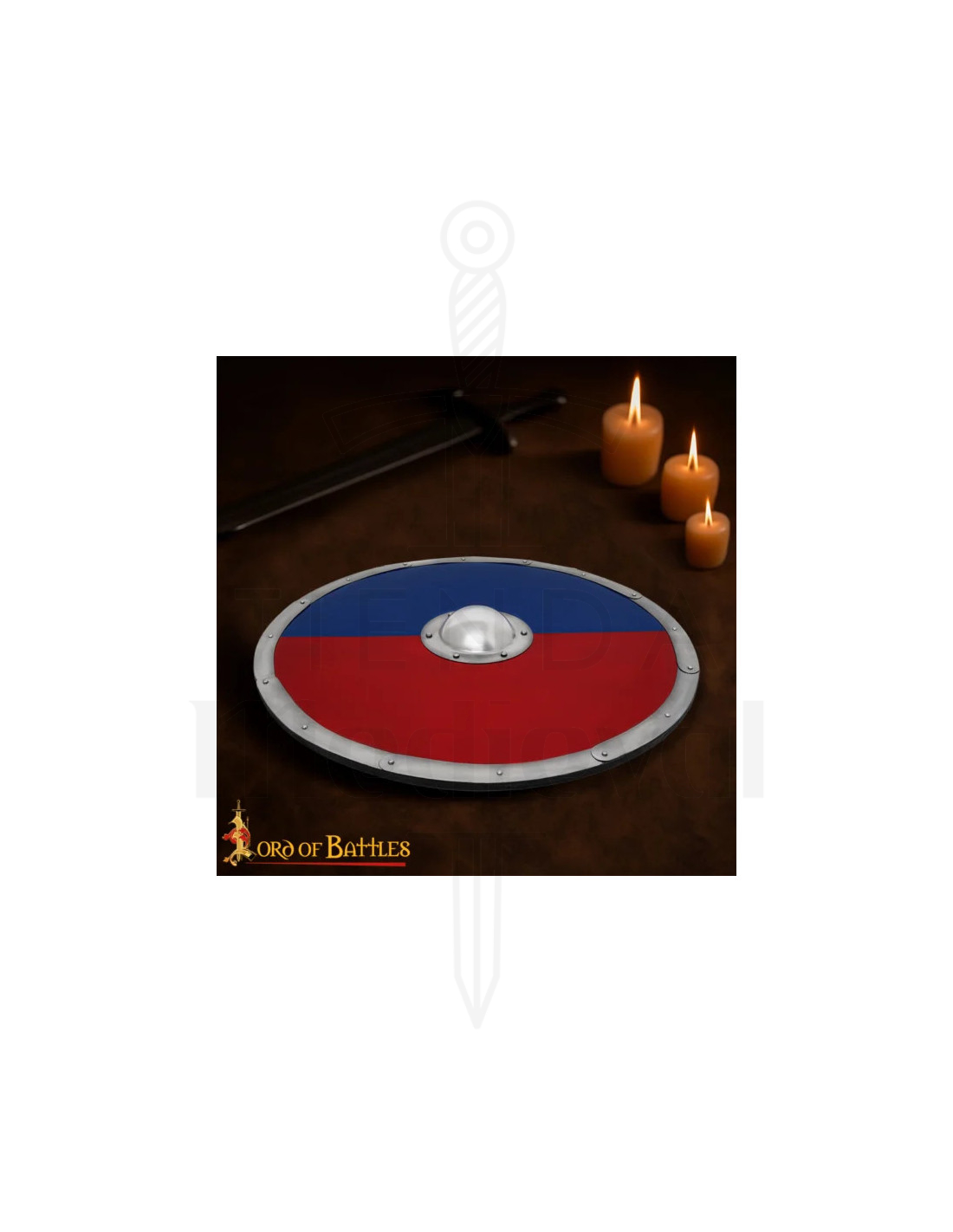 La sorprendente divisione orizzontale in blu sopra e rosso sotto crea un contrasto visivo perfetto per spettacoli, ricreazioni o decorazioni, mentre il bordo metallico ribattuto aggiunge un sigillo di realismo che resiste all'uso continuato. Il pomello centrale metallico, fissato con ribattini, non solo rinforza l'estetica, ma protegge la zona di presa e accentua quel aspetto autentico di equipaggiamento da combattimento.