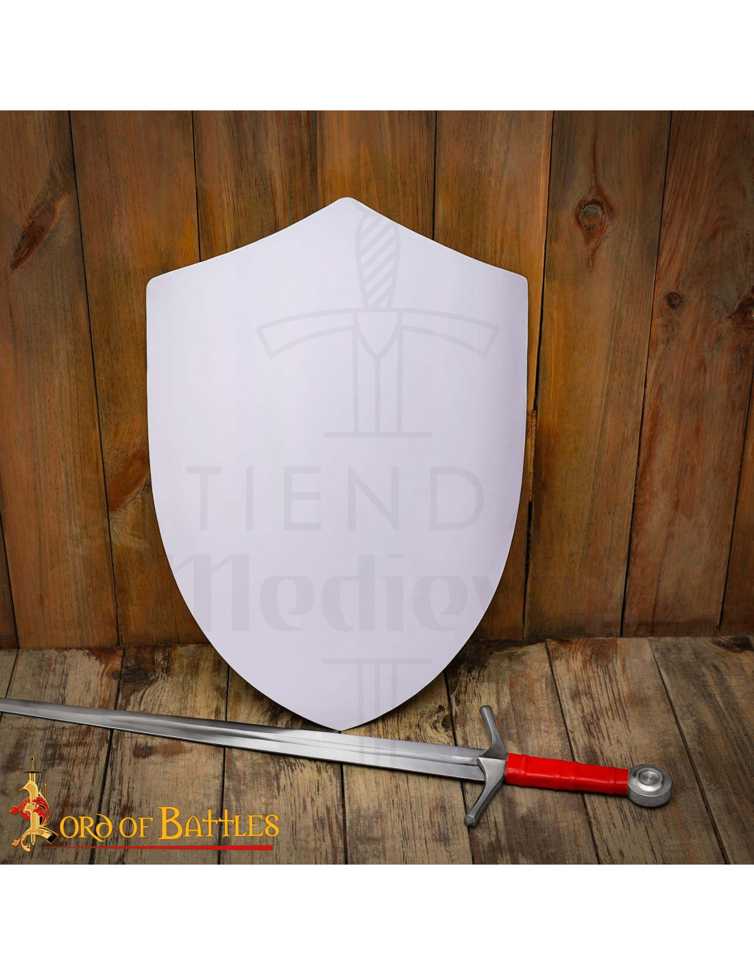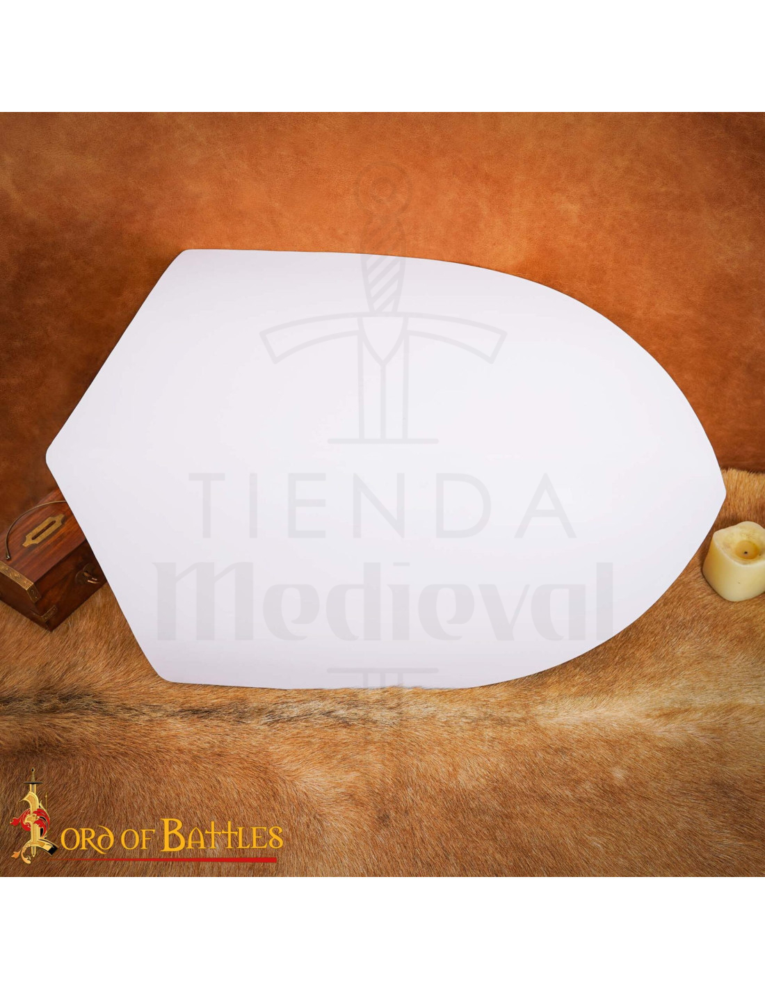 La sua superficie levigata e chiara, come si vede nell'immagine, offre una tela perfetta per trasformare lo scudo nel tuo proprio vessillo. Puoi decorarlo con una croce templare, uno scudo araldico personale, o lasciarlo nella finitura metallica per un aspetto sobrio ed elegante.