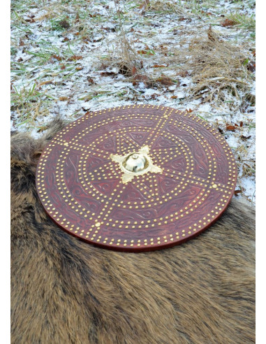 Questo scudo è pensato per chi desidera qualcosa in più di un semplice accessorio, ha bisogno di un pezzo che rafforzi l'identità di guerriero d'epoca che si cela in te. Con un supporto bullonato e rivestito in cuoio, offre una presa sicura, stabile e confortevole, affinché tu possa brandirlo con la sicurezza di un autentico cavaliere o guerriero medievale. Immagina di impugnarlo e sentire il suo peso tra le mani, percependo come ti collega ai combattimenti antichi in cui il coraggio e la precisione definivano vite. Sia in ricreazioni, battaglie fittizie o nella tua esposizione personale, questo scudo agirà come un sigillo di autenticità che gli altri potranno ammirare, imitare e invidiare.