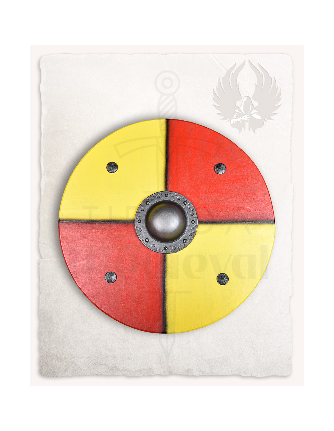 Vuoi apparire autentico nelle tue sessioni di Larp o eventi medievali? Questo grande e vistoso scudo, ispirato all'estetica vichinga, ti permetterà di distinguerti in ogni combattimento. Il suo design circolare e colorato in tonalità di giallo e rosso divise in quattro sezioni, con un centro metallico bombato, aggiunge un tocco di realismo e spirito di battaglia.