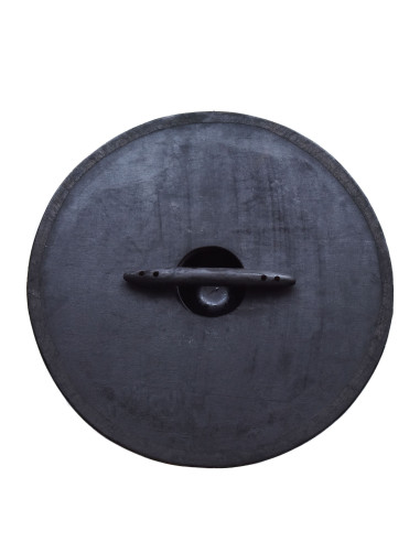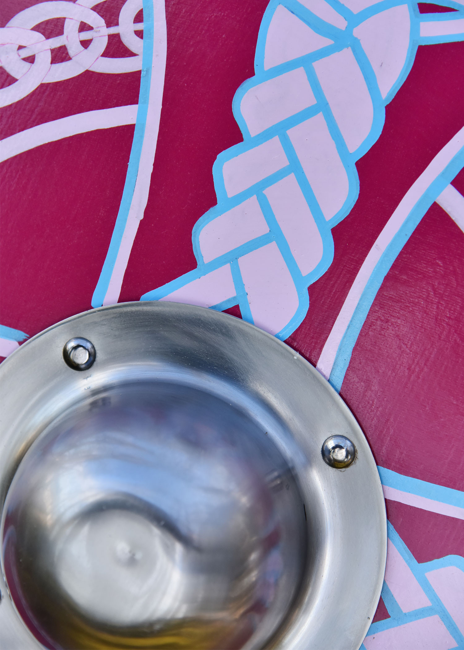 Al centro, lo scudo presenta un rigonfiamento in acciaio sovradimensionato che è tenuto saldamente in posizione con quattro rivetti e lascia spazio sufficiente per ospitare anche le mani vichinghe più forti. La parte posteriore dello scudo è verniciata di nero e dotata di un manico in legno massello.
