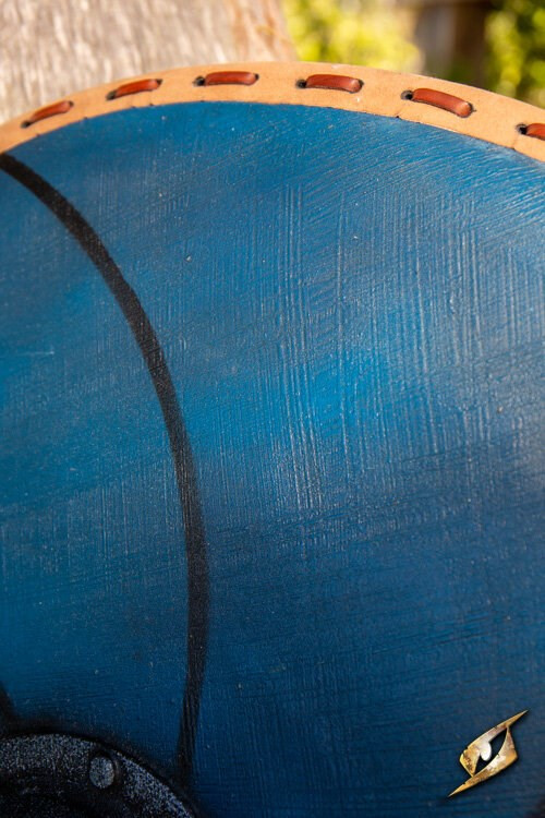 Scudo vichingo Gastir, blu. La parte anteriore dello scudo imita un rivestimento in pelle, secondo una ricerca che indica che questo è stato applicato agli scudi per una maggiore durata.