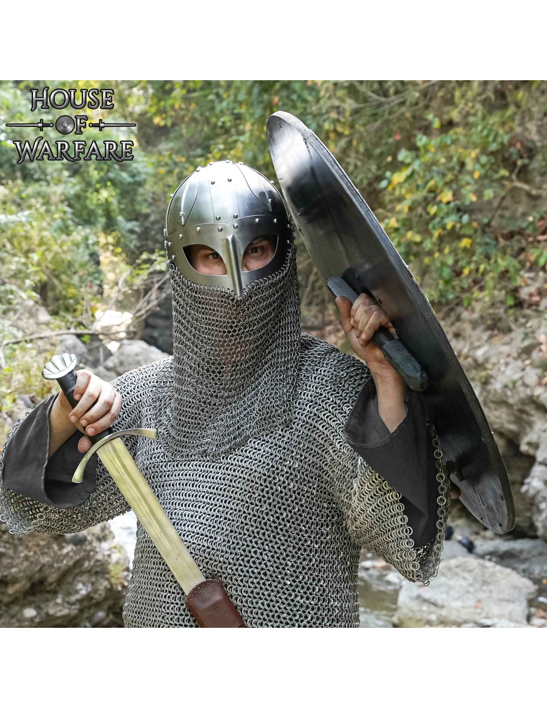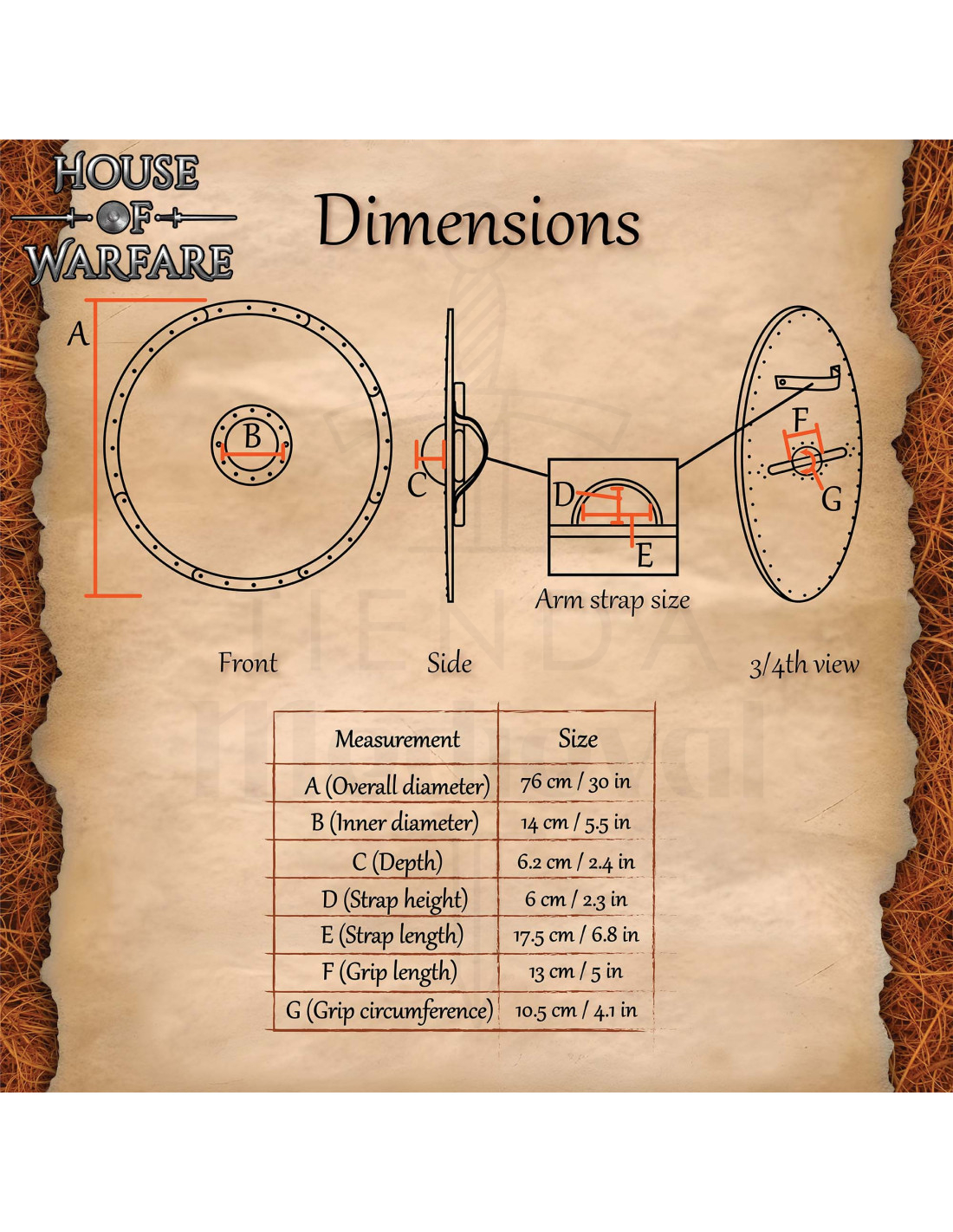 Costruito per durare, la sua realizzazione in legno massiccio offre una sensazione solida al tatto e resistenza agli usi abituali nel LARP o nel teatro, mentre il bordo metallico fissato con rivetti aumenta la durata agli impatti, mantenendo il design fedele ai riferimenti storici.