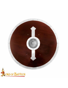 La costruzione artigianale in legno massello, rinforzata con una banda metallica ribattuta e un umbo convesso centrale, significa che hai un supporto affidabile per praticare manovre e assorbire impatti in ricreazioni e LARP, senza rinunciare a un aspetto fedele alla storia. Il pezzo metallico verticale con estremità appuntite che attraversa il fronte non solo rinforza la struttura, ma rafforza anche l'estetica guerriera, creando un motivo visivo convincente.