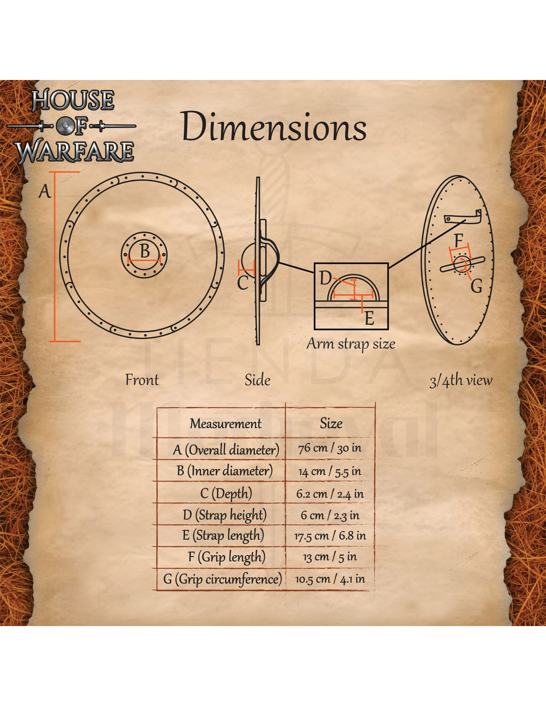 Il colpo curvo e il bordo ribattuto agiscono come protezione efficace per la mano e il perimetro, prolungando la vita utile dell'articolo anche in uso ripetuto, mentre i rivetti visibili rinforzano quel aspetto guerriero che attrae tanto collezionisti e appassionati.