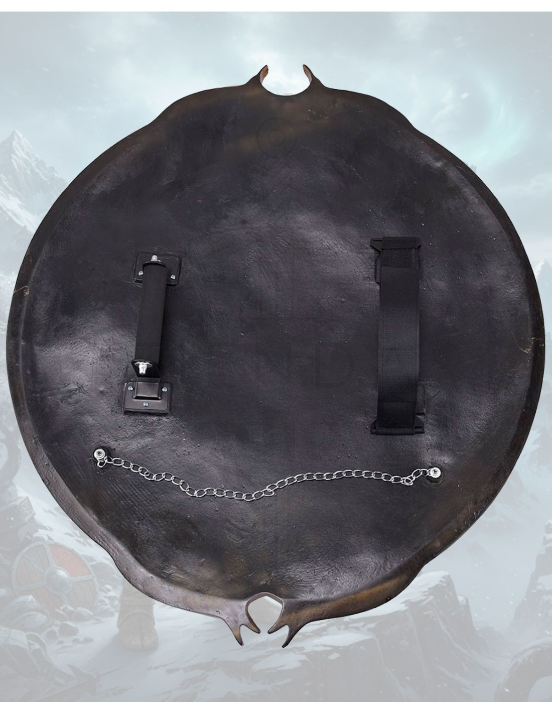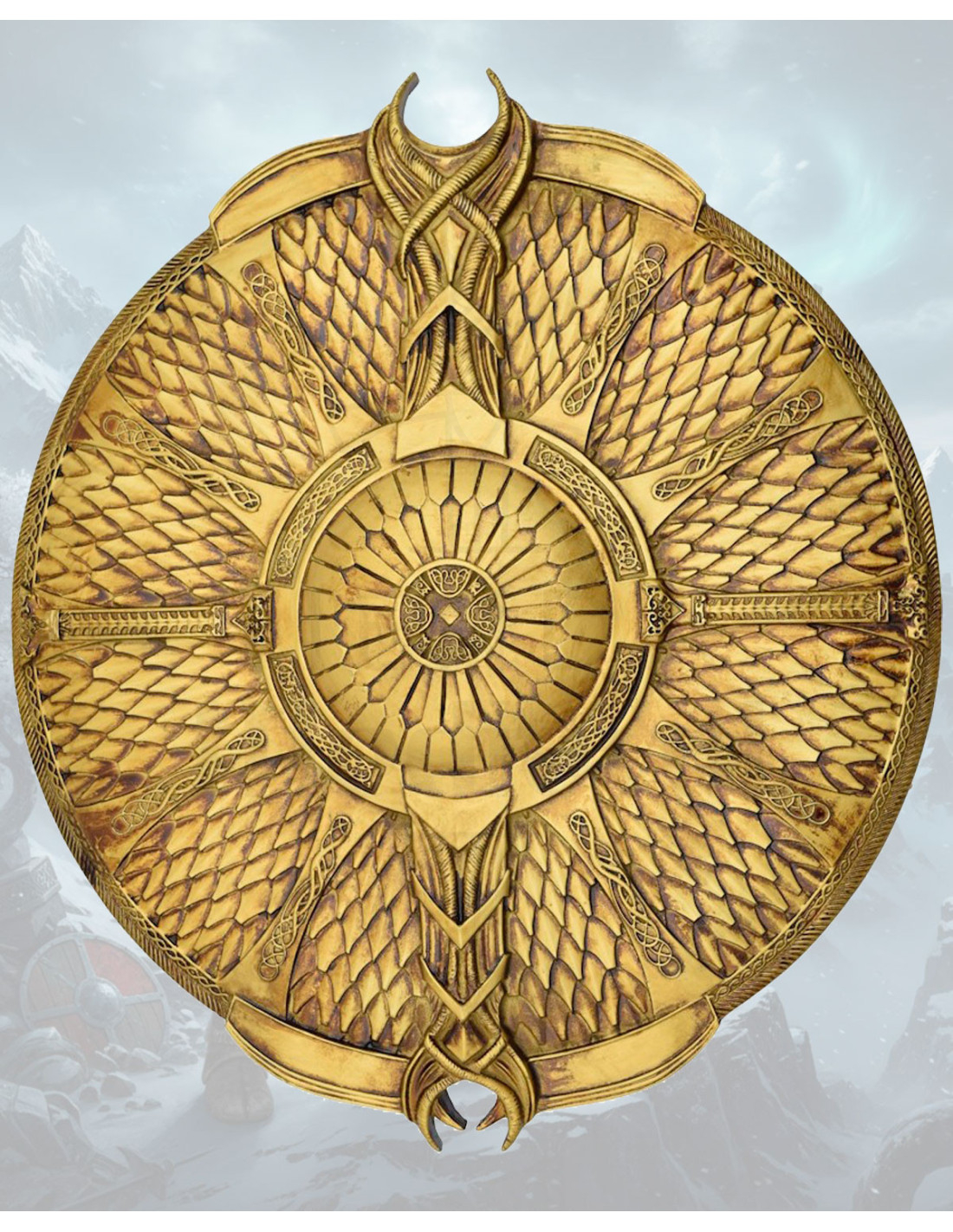 Questo scudo decorativo non ufficiale di Kratos, God of War offre quella presenza epica senza complicazioni, grazie al suo design circolare con rilievo dettagliato che combina motivi a forma di scaglie o piume e intrecci che evocano artigianato antico. La finitura dorata invecchiata esalta ogni contorno, creando ombre e luci che fanno emergere il rilievo da qualsiasi angolazione, mentre le croci e le strutture che lo attraversano conferiscono un carattere dinamico e simbolico.