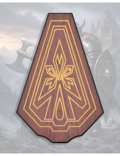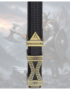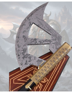Questa replica cattura l'aspetto rude e lavorato dell'arma più ricordata dai fan, offrendo una finitura metallica che simula venature e invecchiamento, affinché il pezzo sembri uscito da una fucina nano. Il design asimmetrico della lama e i fori nella sua struttura creano un gioco di luci e ombre, conferendo carattere e presenza senza perdere l'eleganza decorativa.