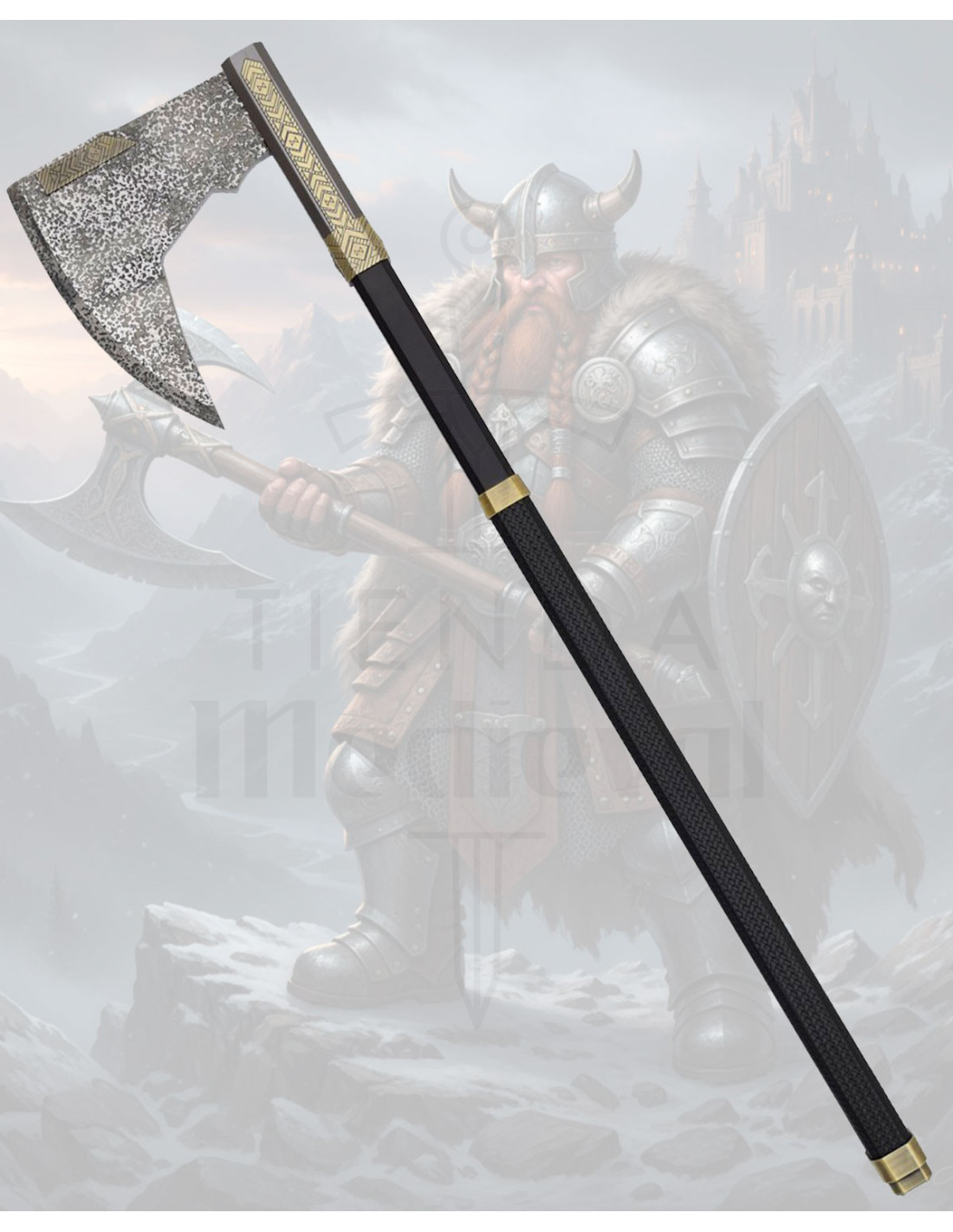 Questa ascia combina un aspetto rustico con dettagli curati, per cui non solo attira l'attenzione, ma facilita anche un'esposizione sofisticata. La lama con finitura maculata trasmette autenticità artigianale, offrendo una sensazione robusta che esalta spazi tematici o saloni con carattere. Il bordo curvato aggiunge dinamismo visivo, facendo sembrare il pezzo pronto per l'azione ma pensato per essere ammirato, non per ingombrare.