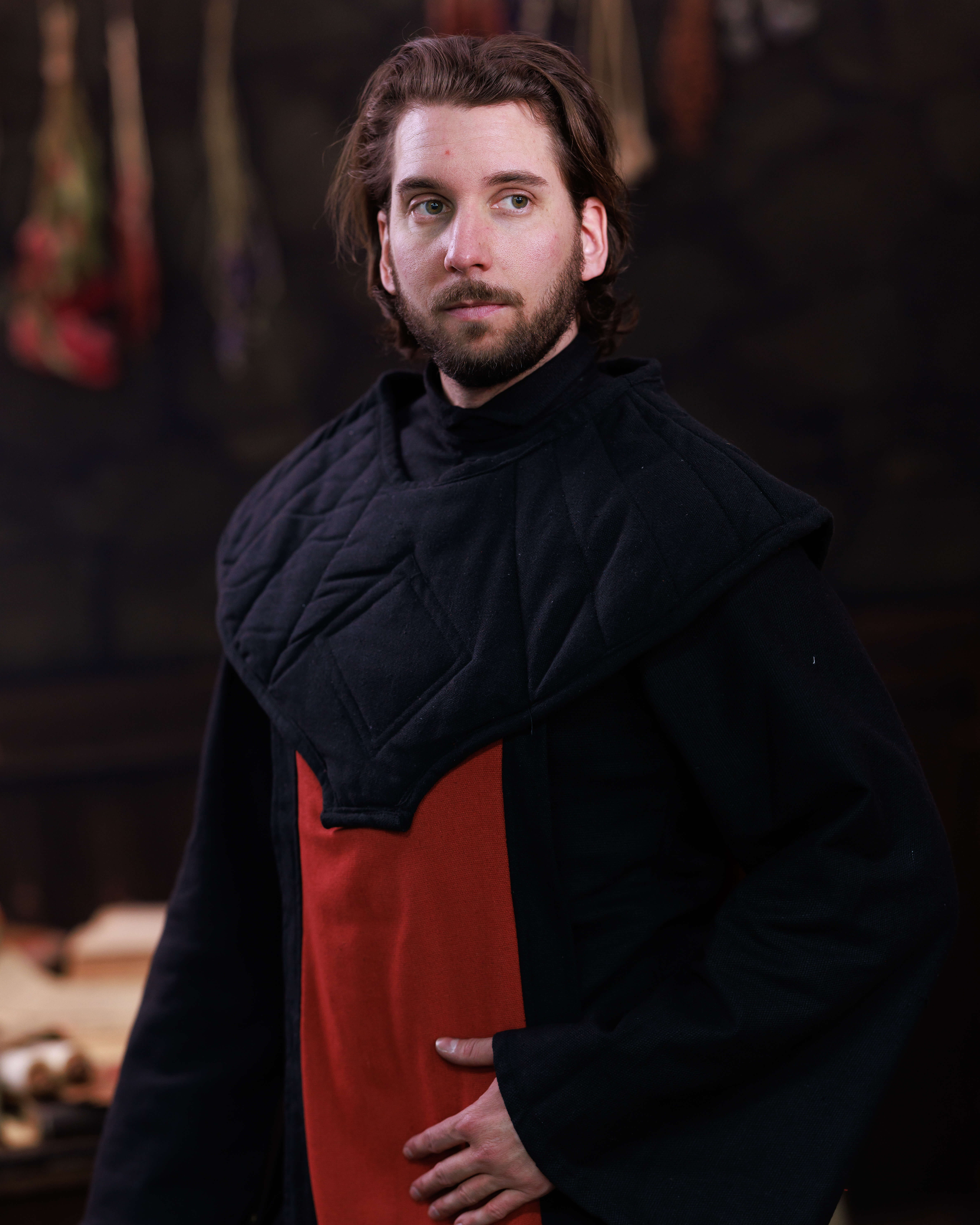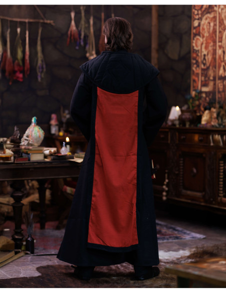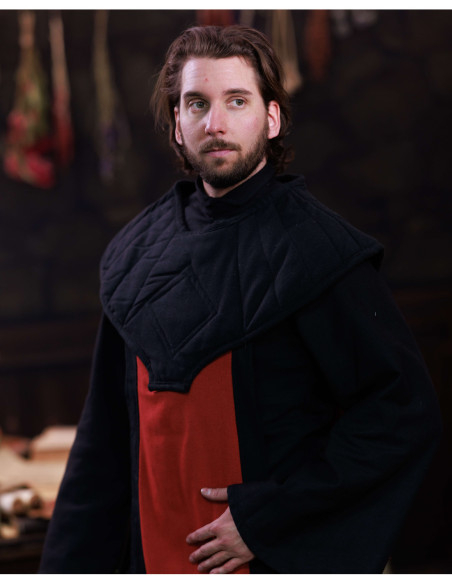 La Sopravvesta medievale con collo imbottito, modello Abraxas combina un'estetica sobria con dettagli pensati per chi cerca autenticità e comfort. Il contrasto tra il nero liscio e il pezzo frontale rosso aggiunge un impatto visivo immediato, ideale per creare personaggi con carattere in ricreazioni, teatro o eventi di fantasia.