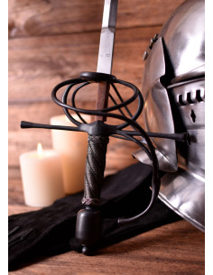 Visivamente, la spada rivela linee rette e una punta affilata che suggeriscono precisione nella stoccata, accompagnata da una guardia a rete che protegge la mano e valorizza l'insieme con eleganza. Il pomolo arrotondato in tono scuro e il manico testurizzato mantengono la sensazione di controllo, e la scabbard rigida color marrone, con rinforzi neri, facilita il trasporto e consente di esporla con orgoglio in qualsiasi spazio.