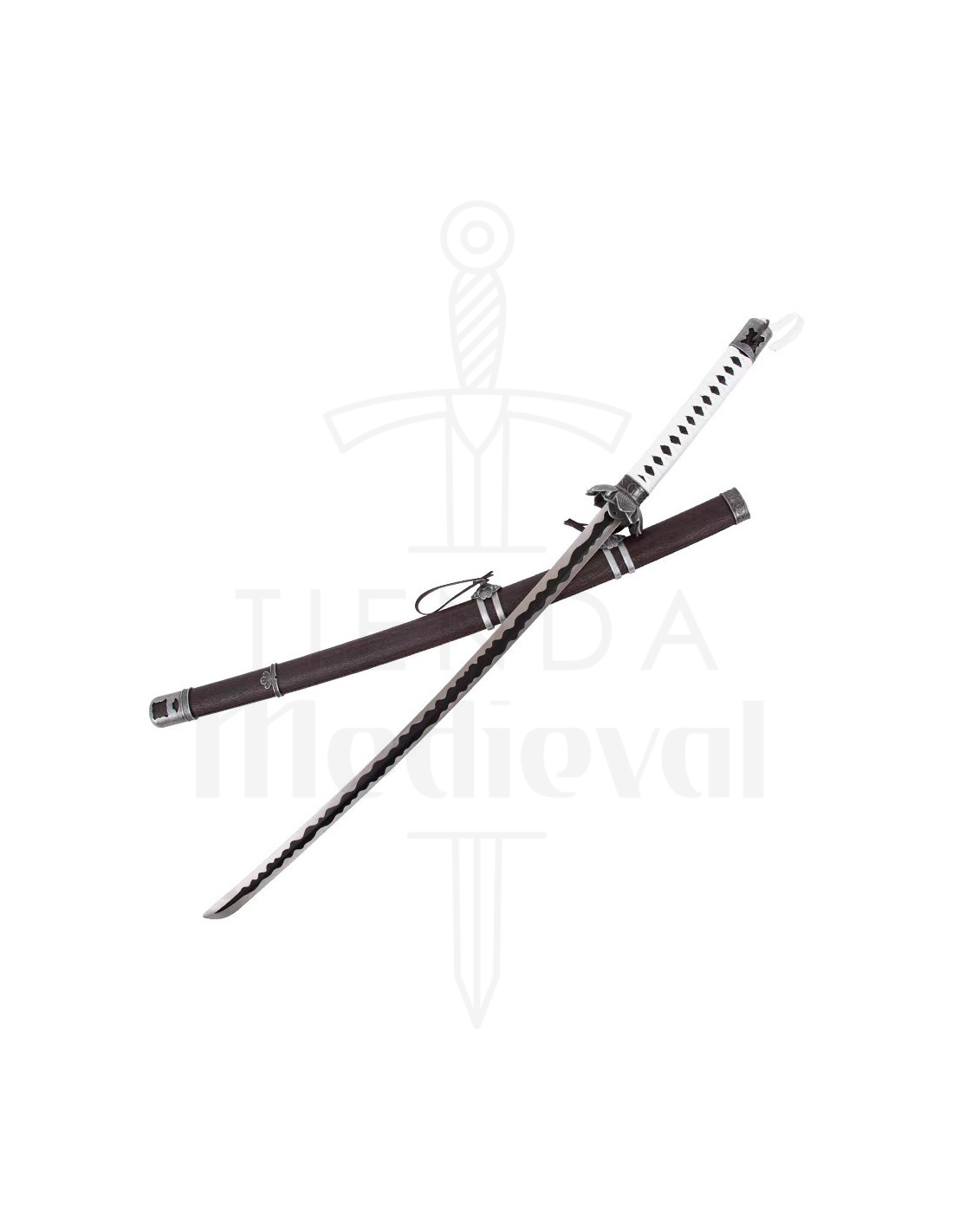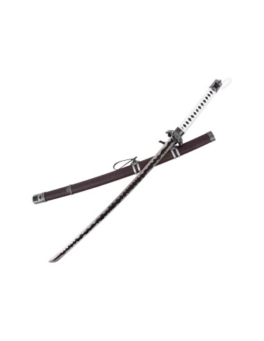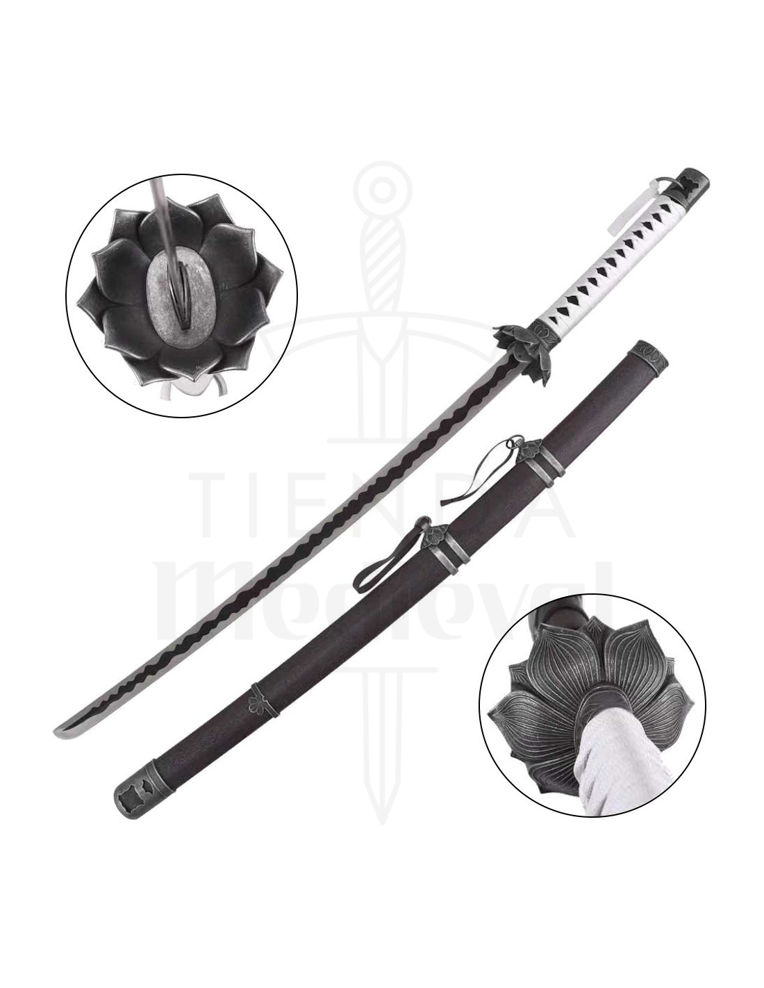 La lama presenta un elegante motivo ondulato scuro lungo tutta la lama, che conferisce un aspetto autentico e raffinato, mentre l'impugnatura, con il suo tessuto bianco a motivo incrociato, offre una presa piacevole e sicura, pensata per sentirsi stabile durante l'uso. La guardia in metallo, con la sua forma floreale a più petali, e gli ornamenti sulla saya completano un aspetto equilibrato e coerente, che aggiunge carattere senza esagerare.