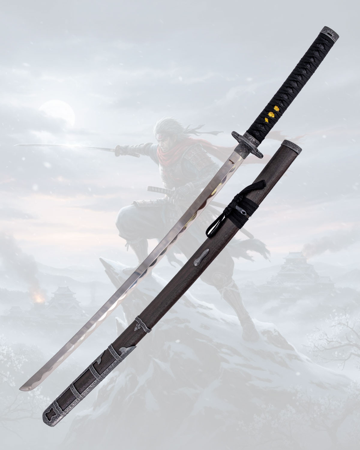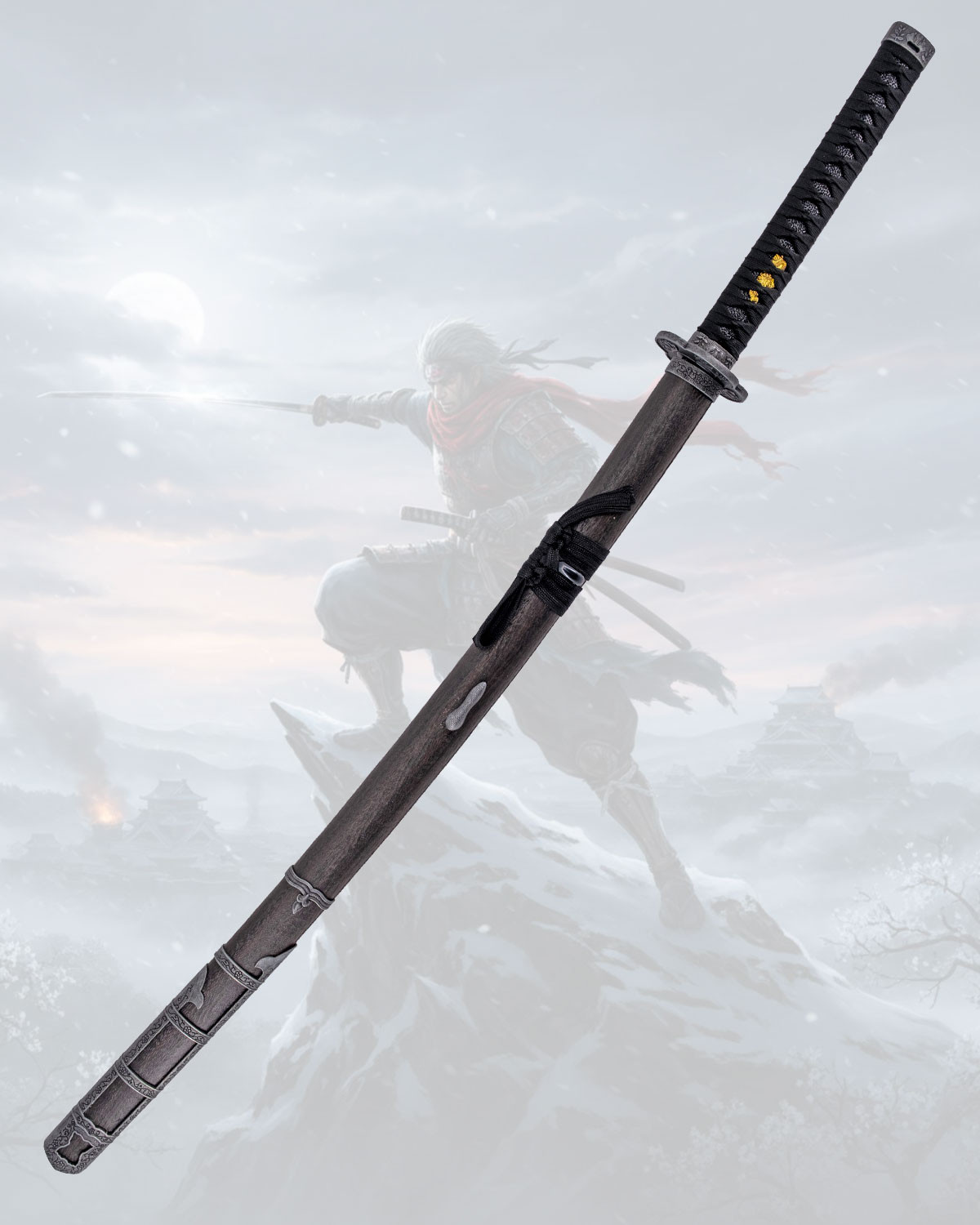Il fodero, di finitura scura tipo legno, incorpora dettagli metallici decorativi anch'essi in rilievo, che elevano la presentazione e proteggono la katana durante il trasporto. La corda nera annodata attorno al fodero aggiunge funzionalità per assicurare il pezzo e facilita il suo trasporto, mantenendo tutto in ordine e con un’aria tradizionale.