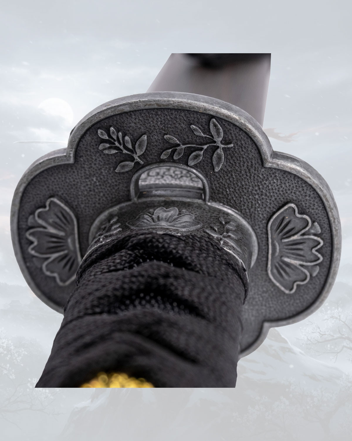 Il manico, avvolto in un tessuto nero intrecciato, garantisce una presa sicura e confortevole, pensato per manovrarla con disinvoltura. I simboli dorati presenti nell’involucro aggiungono un tocco di distinzione, creando contrasto e personalità senza perdere la sobrietà del tutto. La guardia di tono scuro, con incisioni in rilievo e design semplice, incornicia il pezzo con discrezione e carattere.