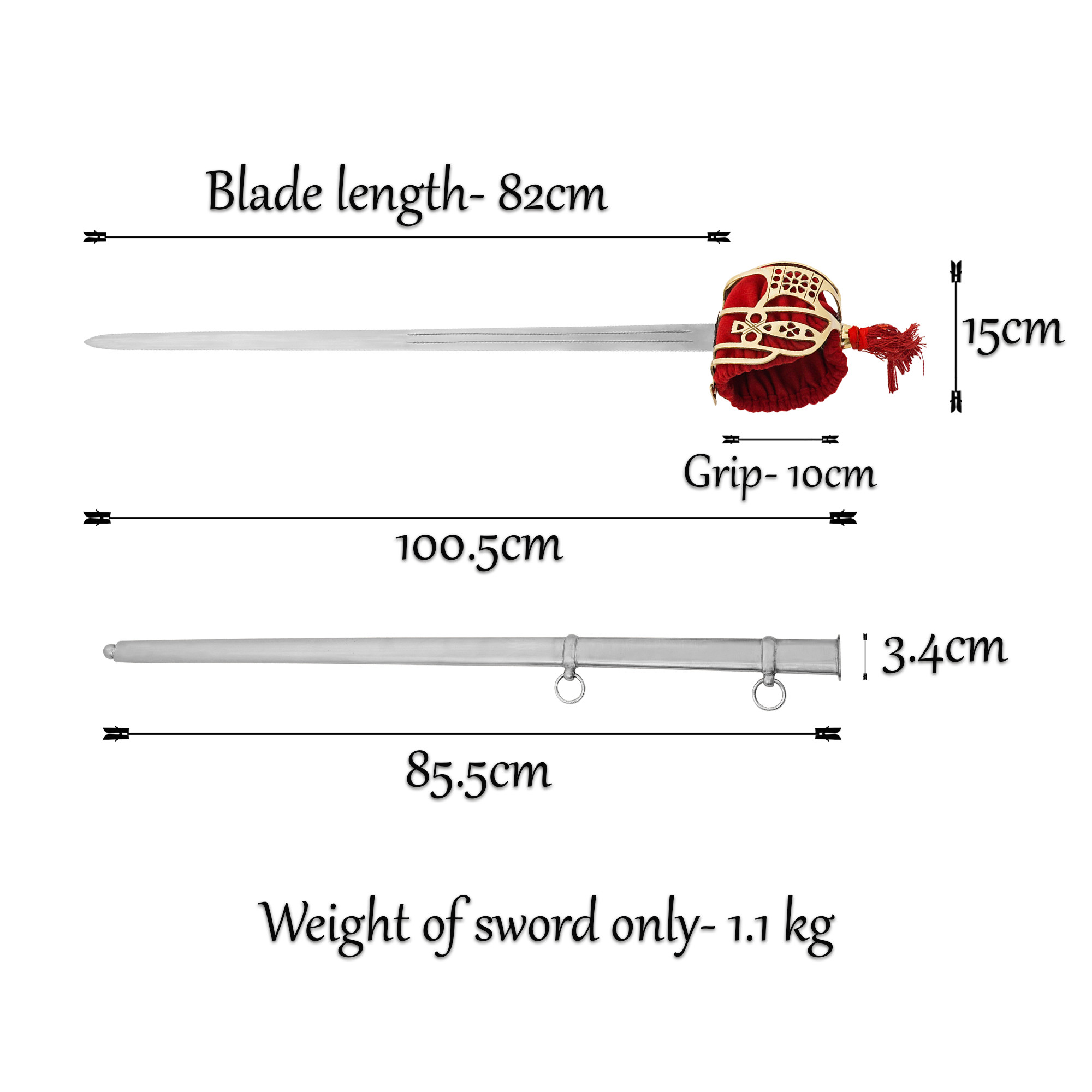 Perfetta per esposizioni, rievocazioni storiche o come pezzo forte nella tua casa, questa spada cattura l'essenza dello spirito guerriero scozzese. Ogni elemento, dalla maniglia in ottone massiccio al cestino bordato in tessuto rosso, è stato progettato con precisione e cura, assicurandoti di possedere non solo una replica, ma un pezzo di storia.