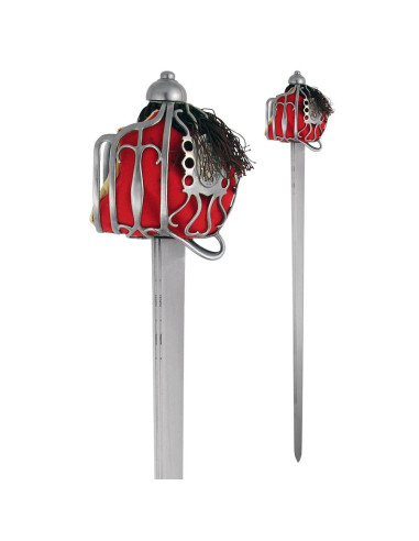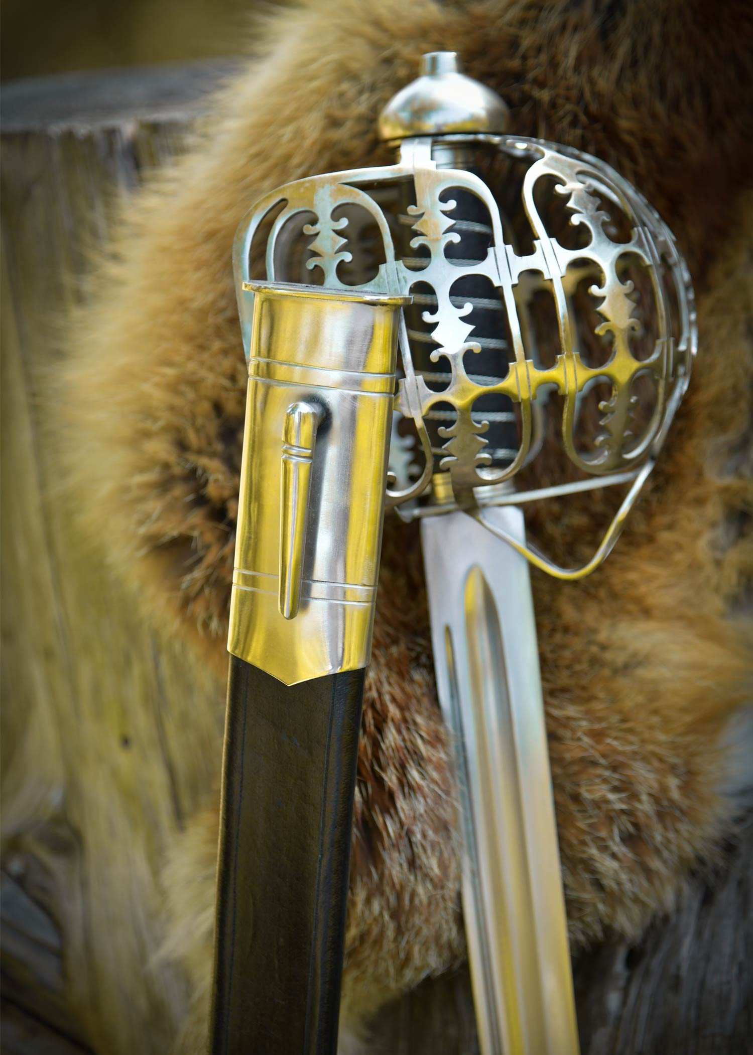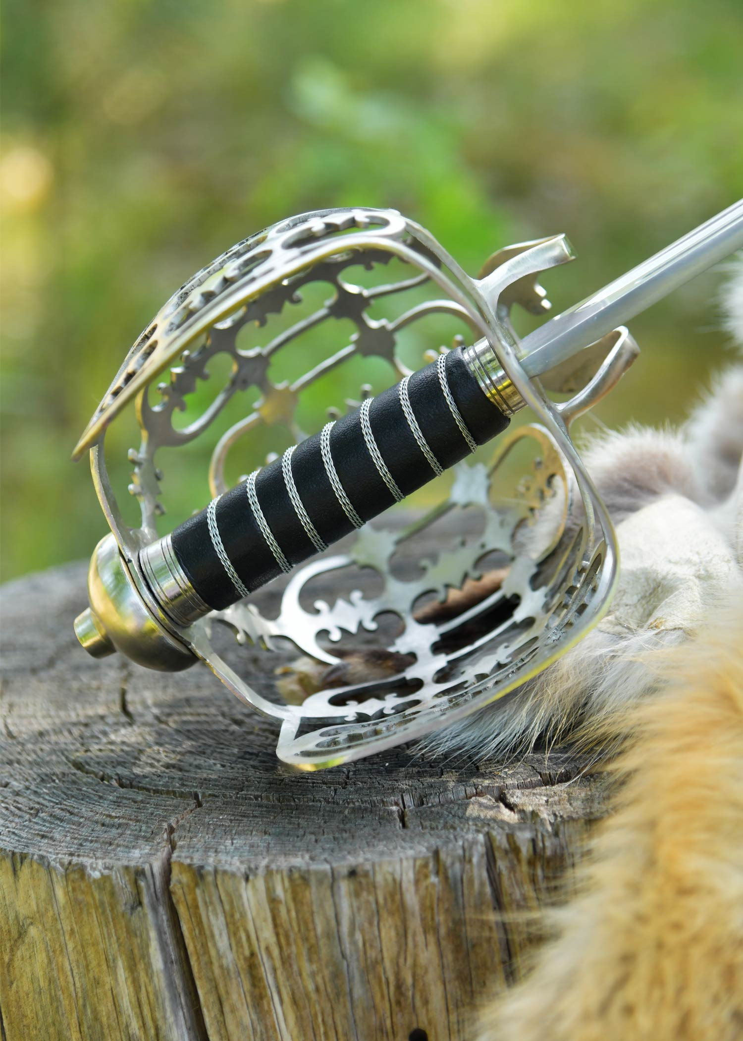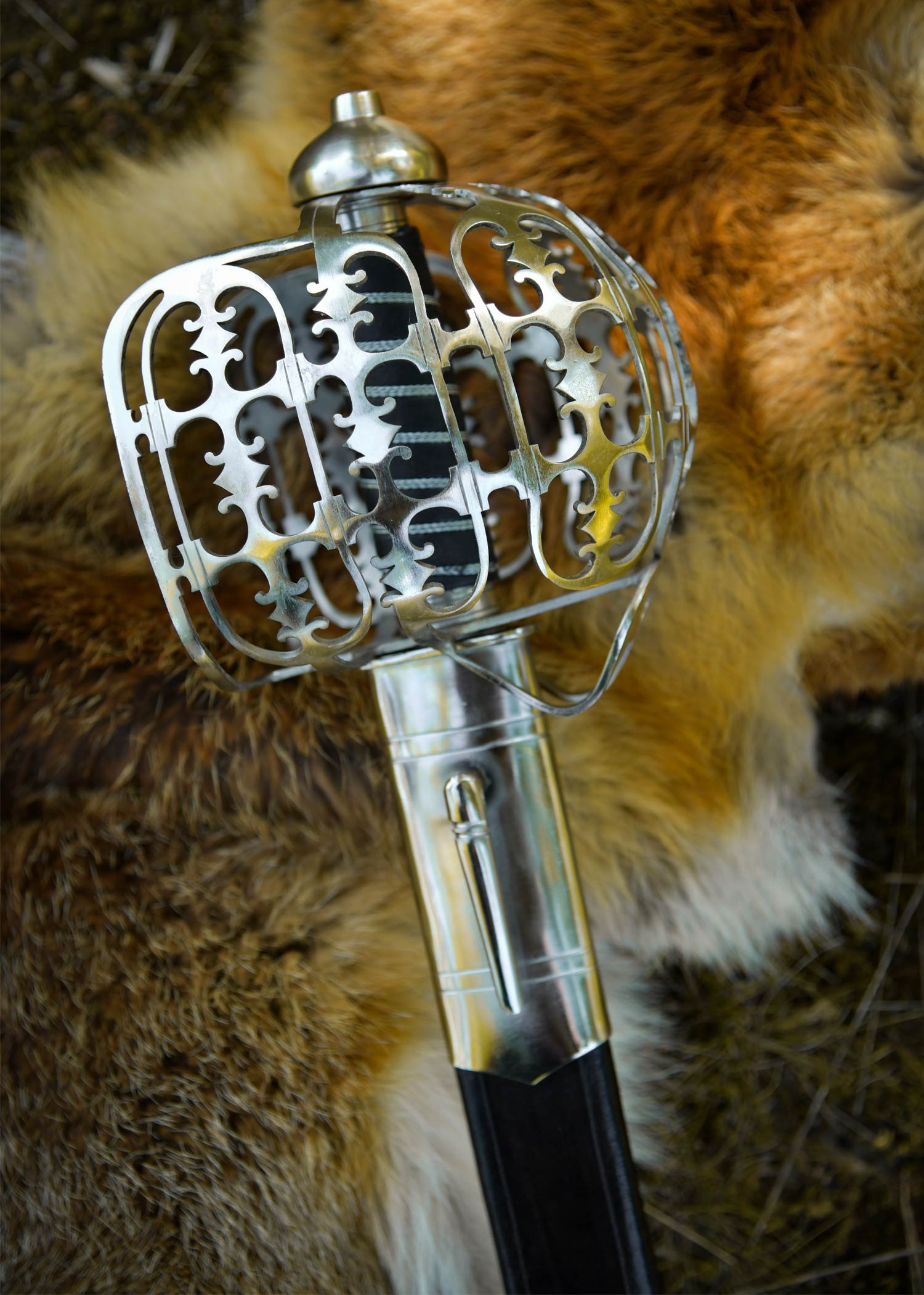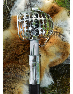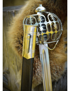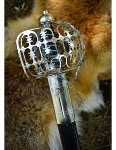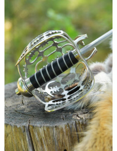Il pomolo con nucleo in legno, rivestito in pelle nera e rifinito con un avvolgimento in filo metallico, assicura una presa salda e visivamente fedele all'originale, conferendo calore al tatto e un finish storico. La guardia a gabbia in acciaio, finemente traforata e perforata, avvolge la mano con un carattere ornamentale che trasmette anche solidità e protezione visiva.