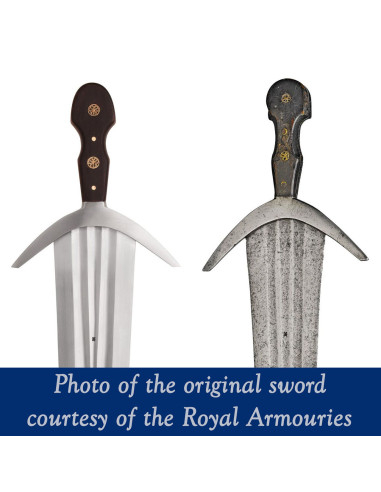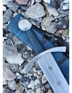 La spada a una mano offerta qui è una riproduzione fedele di questo bellissimo pezzo di storia medievale. Le incisioni sulla larghezza maggiore della lama in acciaio per molle a doppio taglio EN45 riproducono fedelmente i segni che adornano l'originale. I bordi non sono affilati e l'intero codolo della lama è rivettato al pomo. L'elsa è composta da una traversa curva leggermente verso il basso, uno spesso pomello della ruota e un'elsa con anima in legno con una stretta legatura in corda di pelle blu. La guardia e il pomello sono realizzati in solido acciaio.