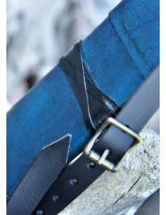 Questa spada da cavaliere medievale viene fornita completa di un fodero in pelle blu e legno con due cinghie regolabili in pelle nera e dotate di fibbie in ottone antico.