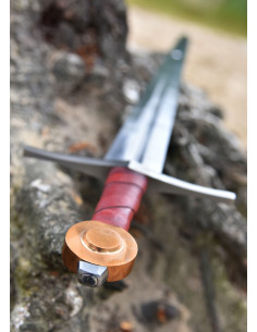 La nostra economica riproduzione decorativa di questa spada cavalleresca ha una lama in acciaio per molle EN45 ampia e uniformemente affilata che è arrotondata su entrambi i lati per circa due terzi della sua lunghezza. I bordi non sono affilati e l'intero codolo della lama viene martellato fino al pomo. L'elsa è costituita da una traversa in acciaio, un'elsa con anima in legno avvolta in pelle tinta marrone rossastra e un pomolo in bronzo a forma di disco sormontato da un blocco d'acciaio.