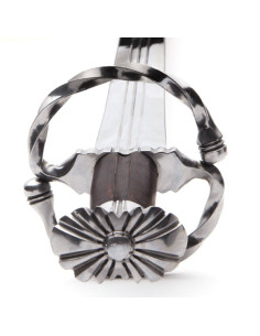 Questa spada ha una presa magnificamente resa che attirerà sicuramente l'attenzione di qualsiasi Landskecht. Il pomo presenta una dentellatura perfettamente estesa verso l'elsa in legno, mentre la guardia è sapientemente ritorta a spirale e rifinita con una mezza sfera.