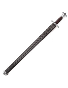 Il fodero in pelle nera è un altro punto forte di questa spada. È decorato con fasce di cuoio incrociate annodate vicino alla gola e rifinite con un'unica punta d'acciaio. La guardia misura 11 cm di larghezza, assicurando che la spada sia protetta in modo sicuro quando non viene utilizzata.
