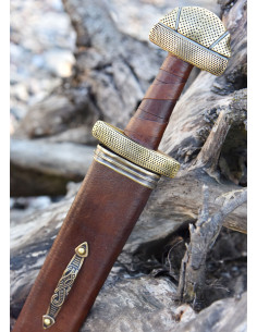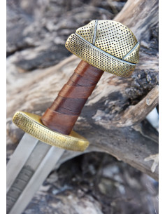 Questo modello è un Tipo E1, secondo la tipologia della spada vichinga di Petersen, ed è caratterizzato dall'ornamento di celle semplici sull'elsa. L'astina e il pomo sono ornati da numerosi fori rotondi disposti in linee che formano un motivo a scacchiera. Inoltre, l'impugnatura in legno è rivestita in pelle marrone per una presa salda e confortevole. La spada si presenta in un fodero in pelle marrone e legno con finiture in ottone antico.