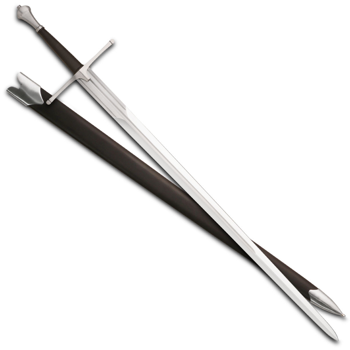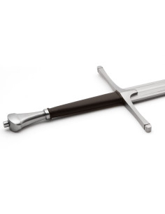 La lama, realizzata in acciaio ad alto contenuto di carbonio, è stata temprata per offrire una resistenza e flessibilità straordinarie, garantendo la sua durabilità e funzionalità. Grazie al suo design conico distale, questa spada è sorprendentemente agile, permettendo manovre rapide e precise. Il ricasso lungo fornisce un vantaggio strategico, poiché puoi afferrare la spada oltre la guardia, trasformandola in una potente lancia corta per attacchi più incisivi.