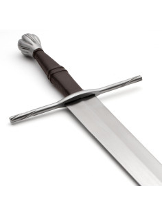 Il manico in pelle, realizzato mediante il processo storico di 'wet-wrap', non solo è visivamente impressionante, ma offre anche una presa ferma e comoda, assicurando un controllo totale in ogni movimento. Le decorazioni in acciaio aggiungono un tocco di eleganza a questo pezzo funzionale e potente. Inoltre, il fodero in pelle marrone scuro con nucleo in legno completa il suo aspetto medievale con uno stile autentico e pratico.