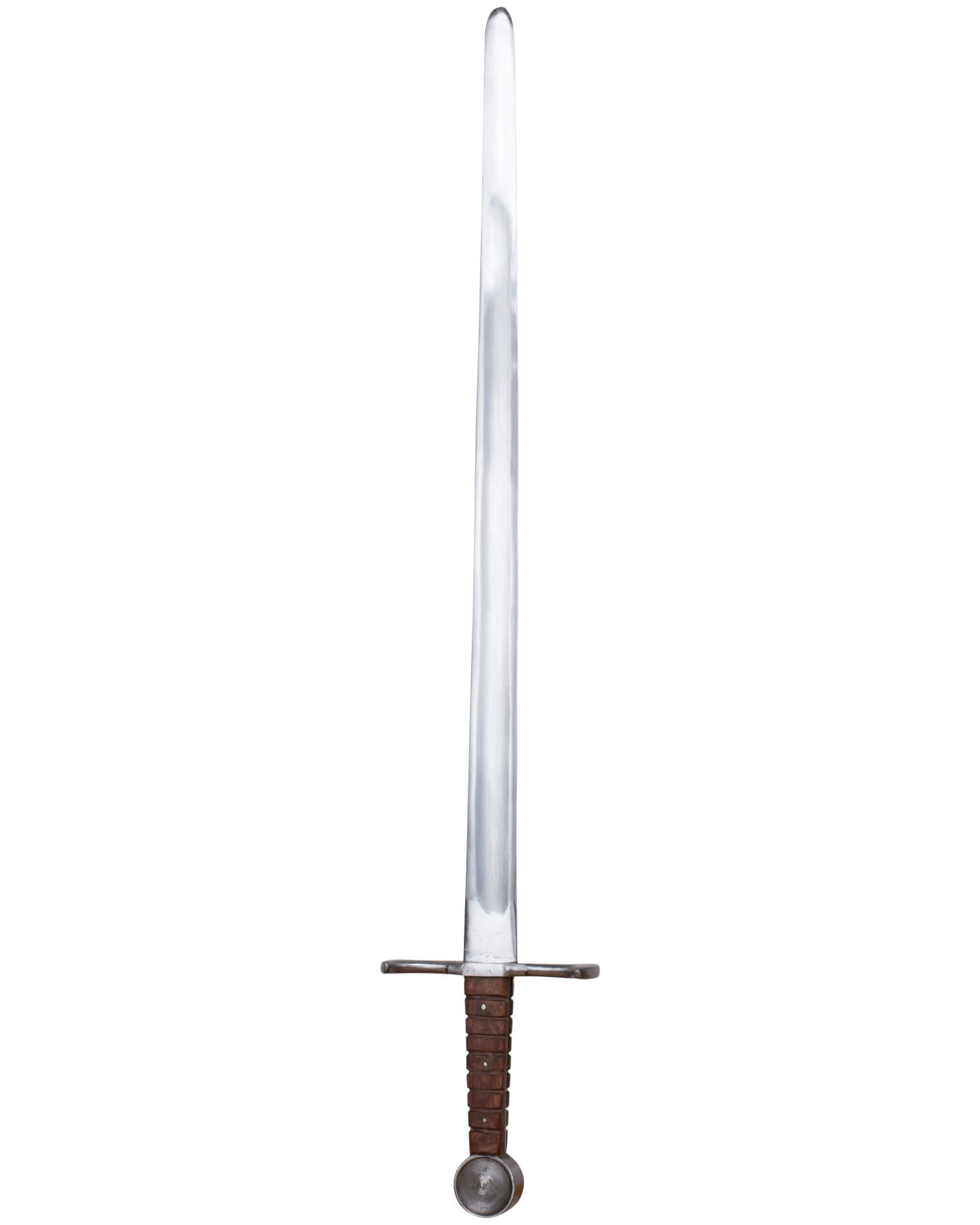 L'immagine mostra un pezzo in condizioni magnifiche, con una lama metallica liscia e lucente che contrasta con la sua resistente impugnatura marrone, rivestita in cuoio sintetico per una presa salda e comoda. Perfetta per appassionati e professionisti che desiderano sfoggiare una replica di qualità o partecipare a rappresentazioni, questa spada è la tua alleata per ricreare con stile e sicurezza le leggende di un tempo.