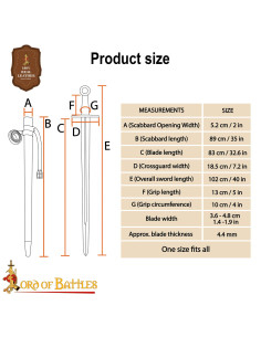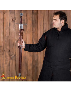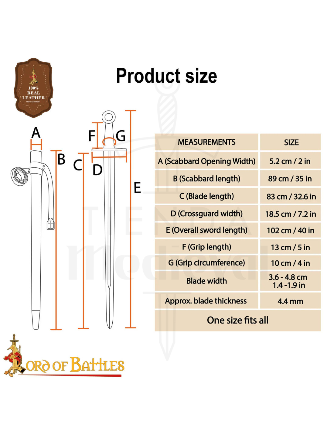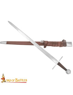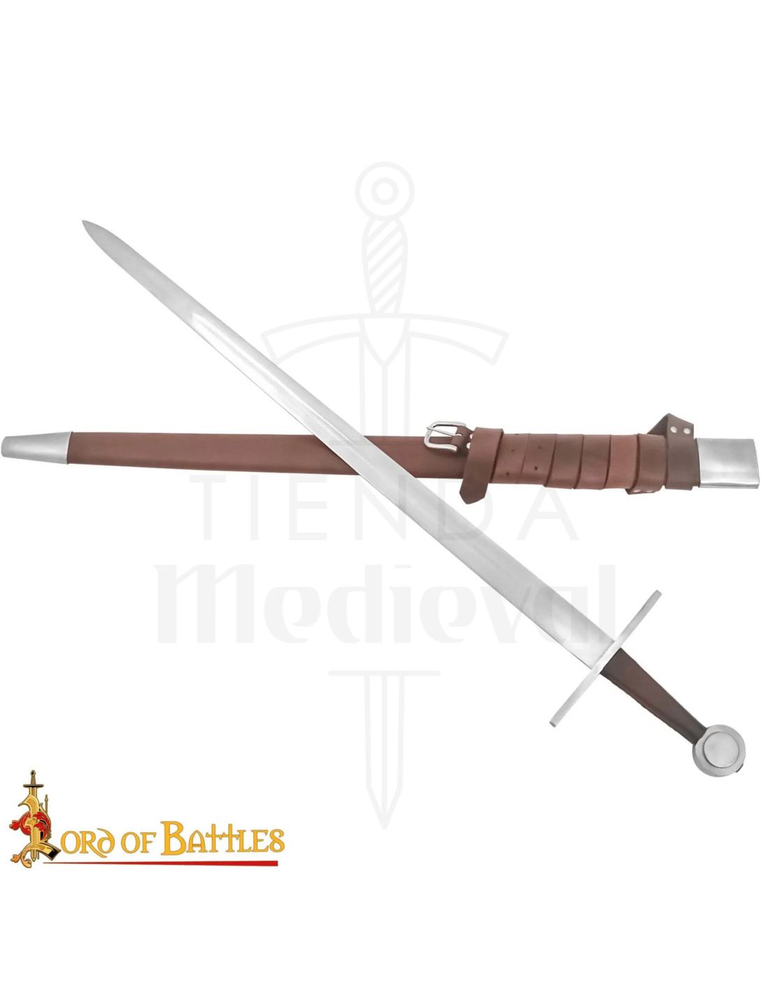 La guaina, con copertura in cuoio marrone e finiture metalliche, protegge il pezzo e facilita il trasporto. La cinghia regolabile con fibbia integrata consente di portarla comodamente e in sicurezza in cintura o a corpo, ideale per ricreazioni, prove e mostre. Ispirata alle spade normanne dei secoli X-XII, offre una connessione visiva ed emotiva con quell'epoca, perfetta per collezionisti e professionisti che apprezzano la fedeltà storica e la funzionalità.