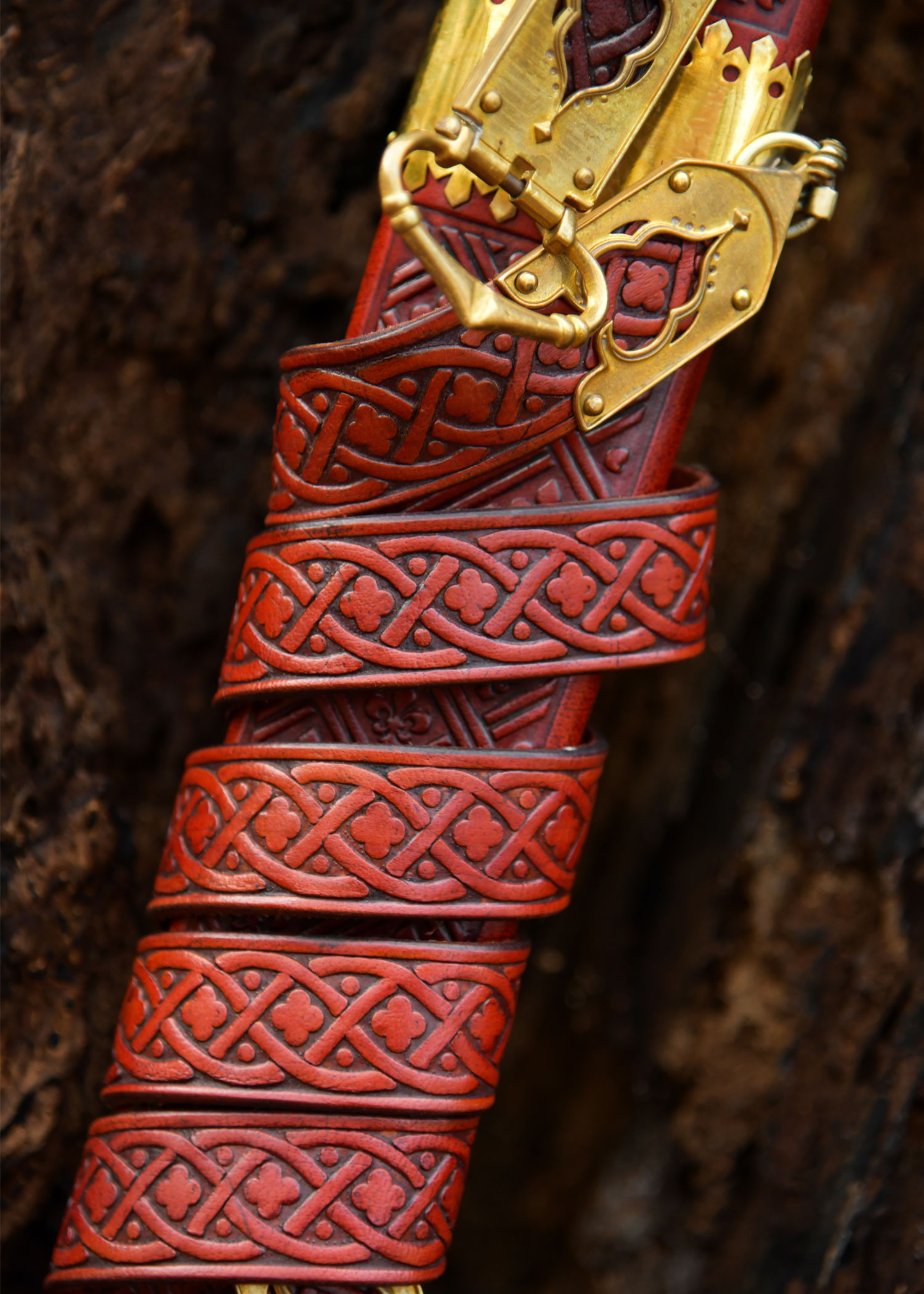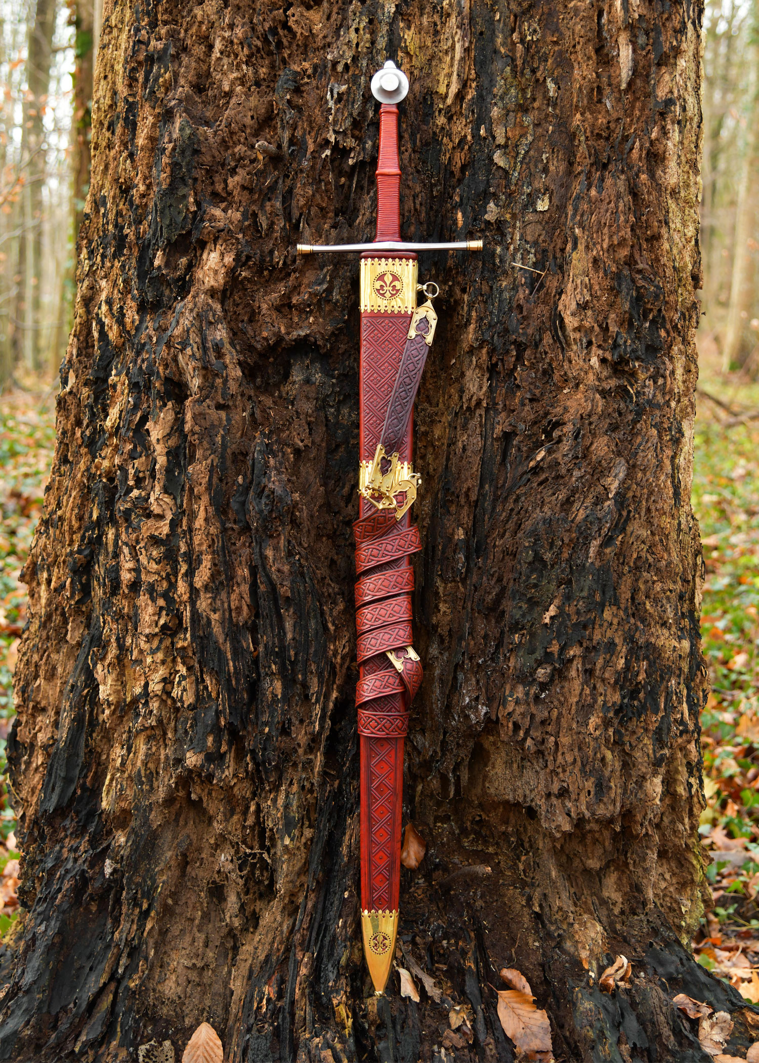 La guaina rigida in pelle rossa scura, con rilievi geometrici e finiture dorate con motivi di giglio, protegge il pezzo e aggiunge una forma elegante e sicura di trasporto. Le sue cinghie e l'anello metallico permettono di portarla saldamente e mostrarla con stile, mentre le decorazioni in rilievo arricchiscono la presentazione, pensata per chi apprezza l'estetica storica.