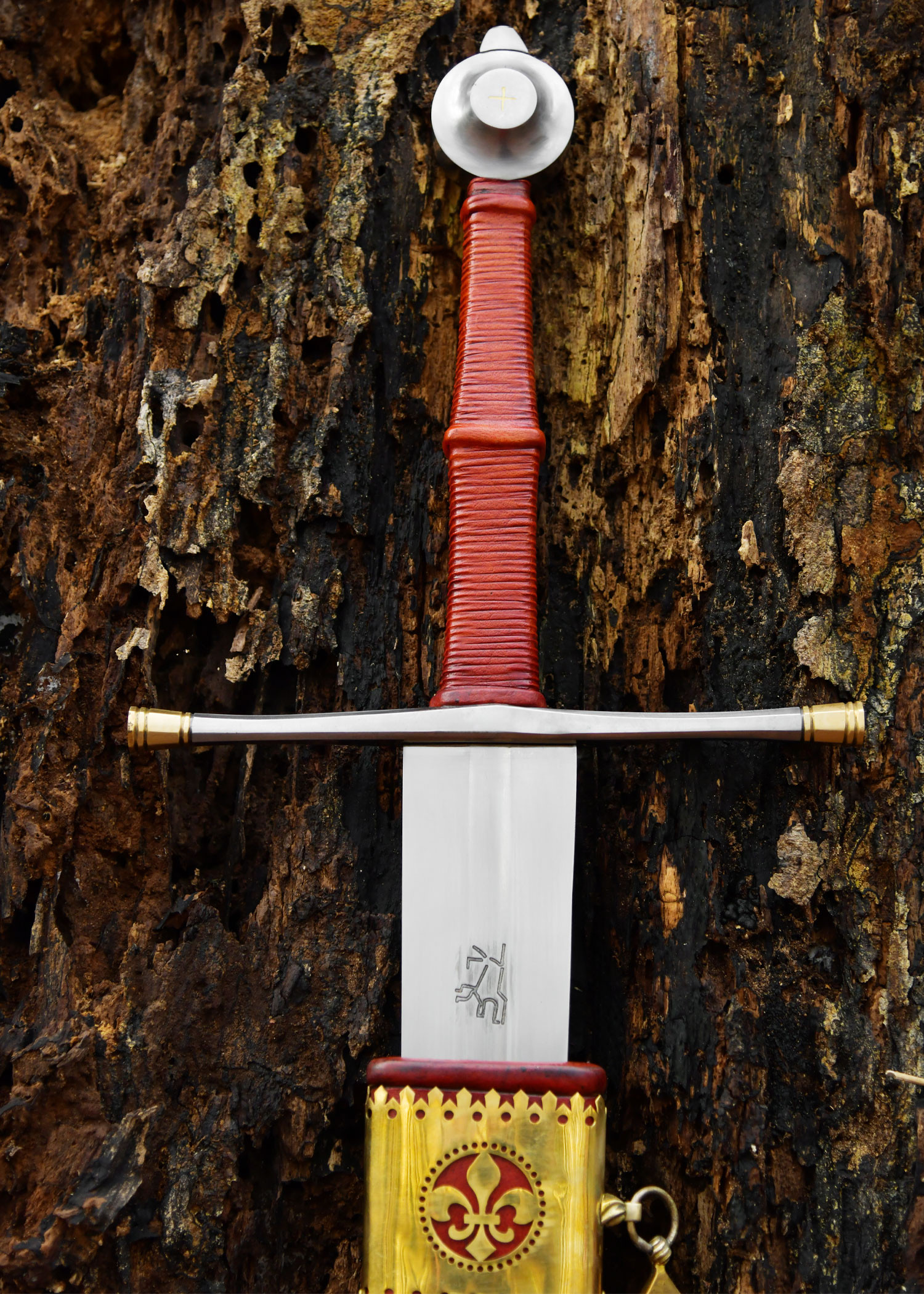 Il manico avvolto in un tono rossastro-arancione assicura una presa comoda e affidabile, ideale per posare la spada con naturalezza o maneggiarla come accessorio nelle ricreazioni. La croce in acciaio e il pomo decorato con croci in ottone bilanciano visivamente il pezzo, facilitando la maneggevolezza e offrendo una finitura in linea con la sua estetica tardo medievale. Il contrasto tra la lama lucida e i dettagli dorati della guaina rinforza il suo aspetto di esposizione selezionata.