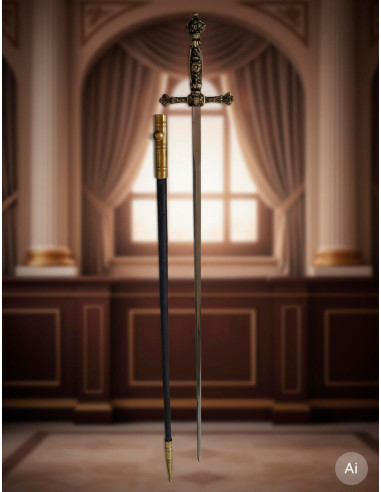 Scopri la Spada cerimoniale con fodero, un autentico gioiello medievale che non può mancare nella tua collezione. Il suo design imponente ed elegante ti trasporterà in epoche passate, mentre la sua qualità e i dettagli accuratamente realizzati ti garantiscono un pezzo unico.