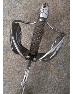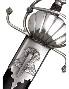 - Guardia a conchiglia con bracci a S: la croce sull'elsa presenta bracci ricurvi a forma di S, dettaglio distintivo dell'epoca. Un elso si curva verso il dorso della lama, mentre l'altro si curva verso il pomo. Il design a conchiglia su un lato della guardia e la sua forma aperta sugli altri lati aggiungono un tocco autentico a questo pezzo.