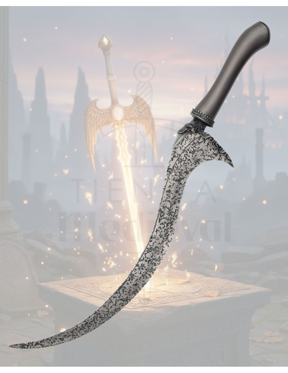 La lama curva e appuntita offre una presenza drammatica che trasforma qualsiasi vetrina o angolo di collezione nel centro dell'attenzione. La sua texture maculata in tonalità grigie e nere apporta profondità visiva, creando un aspetto invecchiato e lavorato che valorizza la decorazione senza necessità di accessori. Il rilievo ornamentale vicino al manico aggiunge un dettaglio artigianale, perfetto se cercate un pezzo con personalità e carattere.