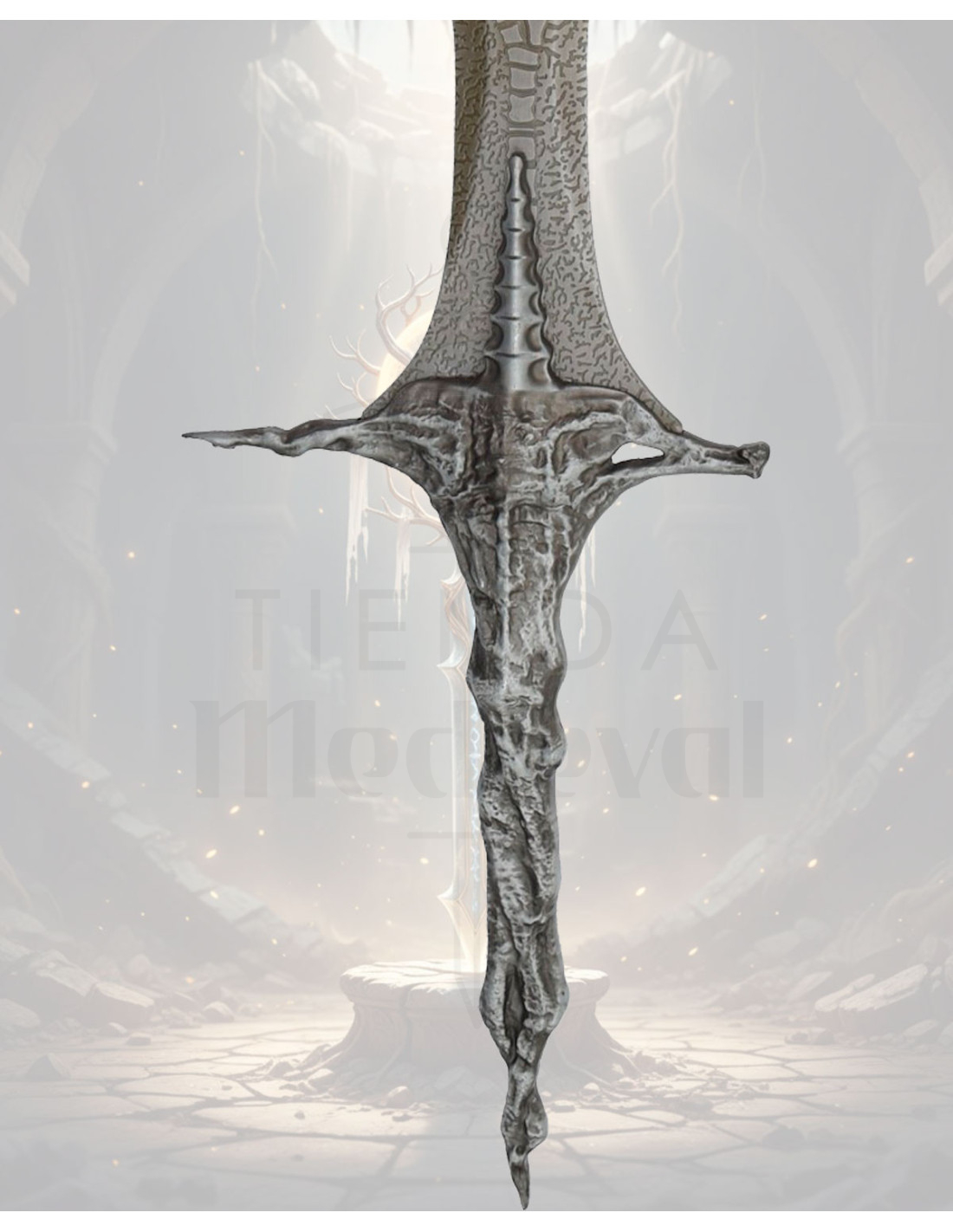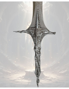 La spada ornamentale Sacred Relic di Elden Ring, con supporto arriva pronta a trasformare qualsiasi parete in un punto focale, grazie alla sua lama allungata e stilizzata che gioca con un gradiente di colore che va da tonalità terrose a un grigio metallico, apportando profondità e drammaticità visiva. Questo finitura opaca e le texture invecchiate suggeriscono storia e autenticità, senza perdere l'eleganza contemporanea.