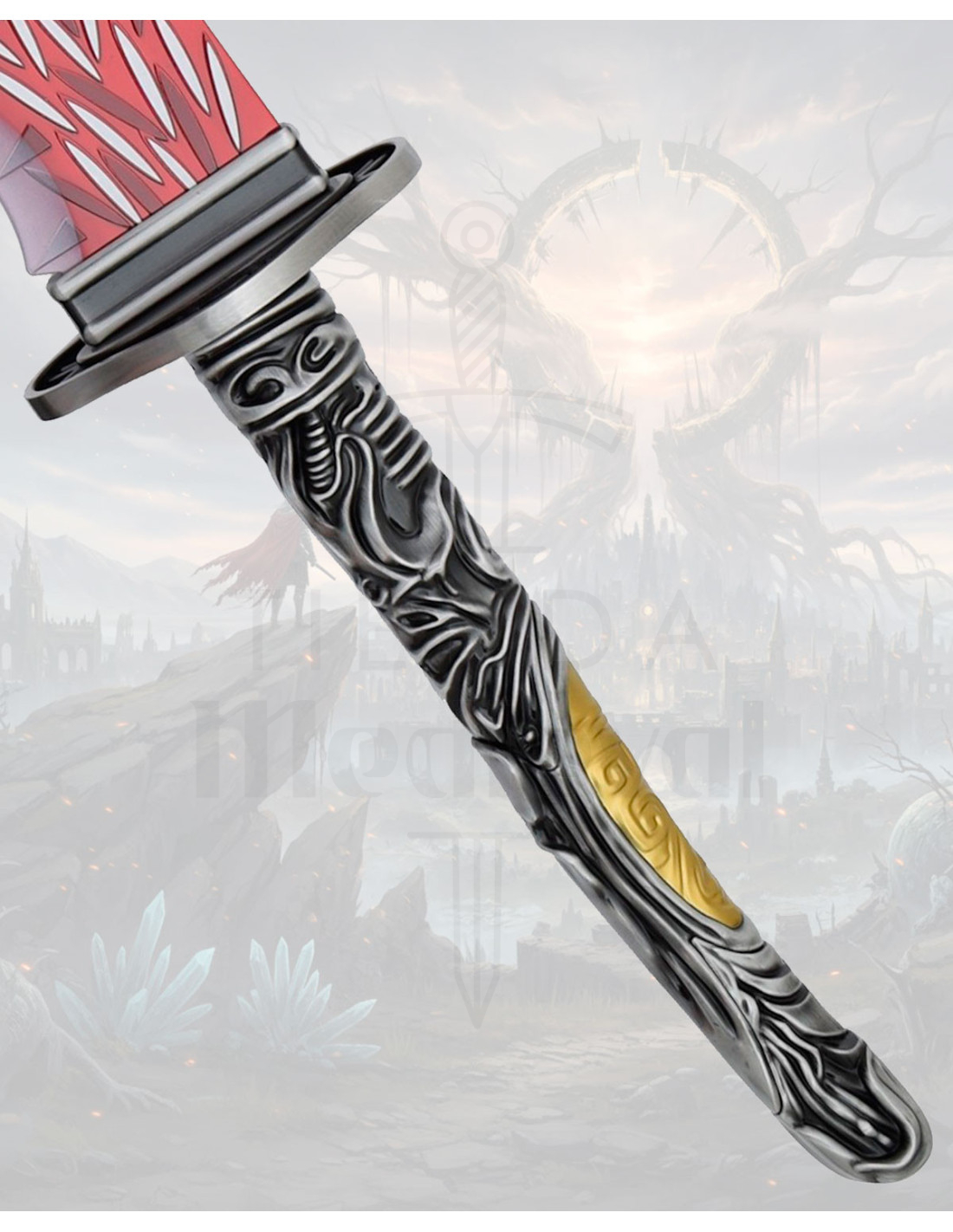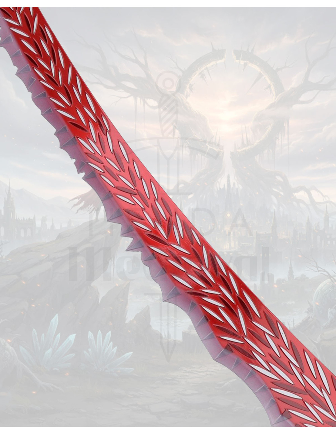 La Grande spada ornamentale del Cacciatore di Draghi, Elden Ring arriva con una finitura che ruba gli sguardi: una lama curva in tonalità rosse decorata con motivi bianchi che ricordano piume, e un filo con dettagli festonati e punte che trasmettono movimento anche a riposo. Quel design pensato conferisce una presenza drammatica, perfetta per essere esposta in salotto, studio o angolo gamer, e per chi cerca una replica con carattere che completi la propria messa in scena o collezione tematica.