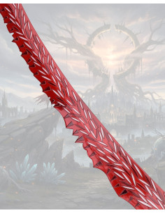 L'affilatura curva, dipinta di rosso con motivi appuntiti e linee che disegnano movimento, crea un effetto drammatico che attrae tutti gli sguardi. Questo bordo seghettato e i suoi tagli irregolari non solo apportano carattere visivo, ma trasmettono una sensazione di potenza e dettaglio, perfetta per chi cerca un pezzo decorativo con presenza e personalità.