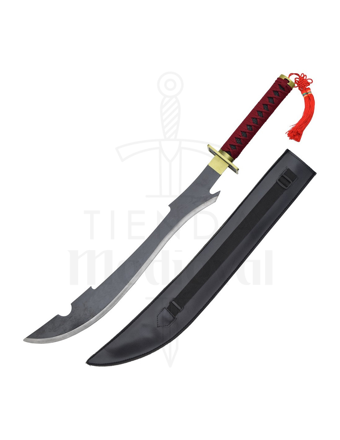 La lama metallica, con il suo tono grigio profondo e i tagli decorativi, conferisce un'aria aggressiva senza compromettere la sicurezza, poiché il filo è presentato smussato, pensato esclusivamente per l'esposizione e l'uso in eventi. La sua forma curvata e la custodia abbinata, adattata a quella curvatura, facilitano il trasporto e consentono di esporla su parete o su supporto con grande stabilità.