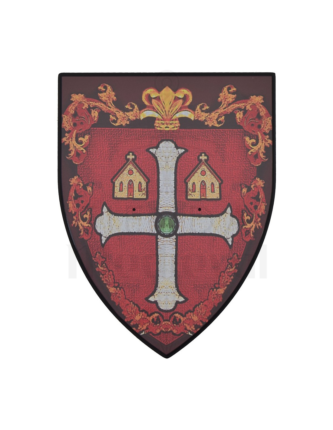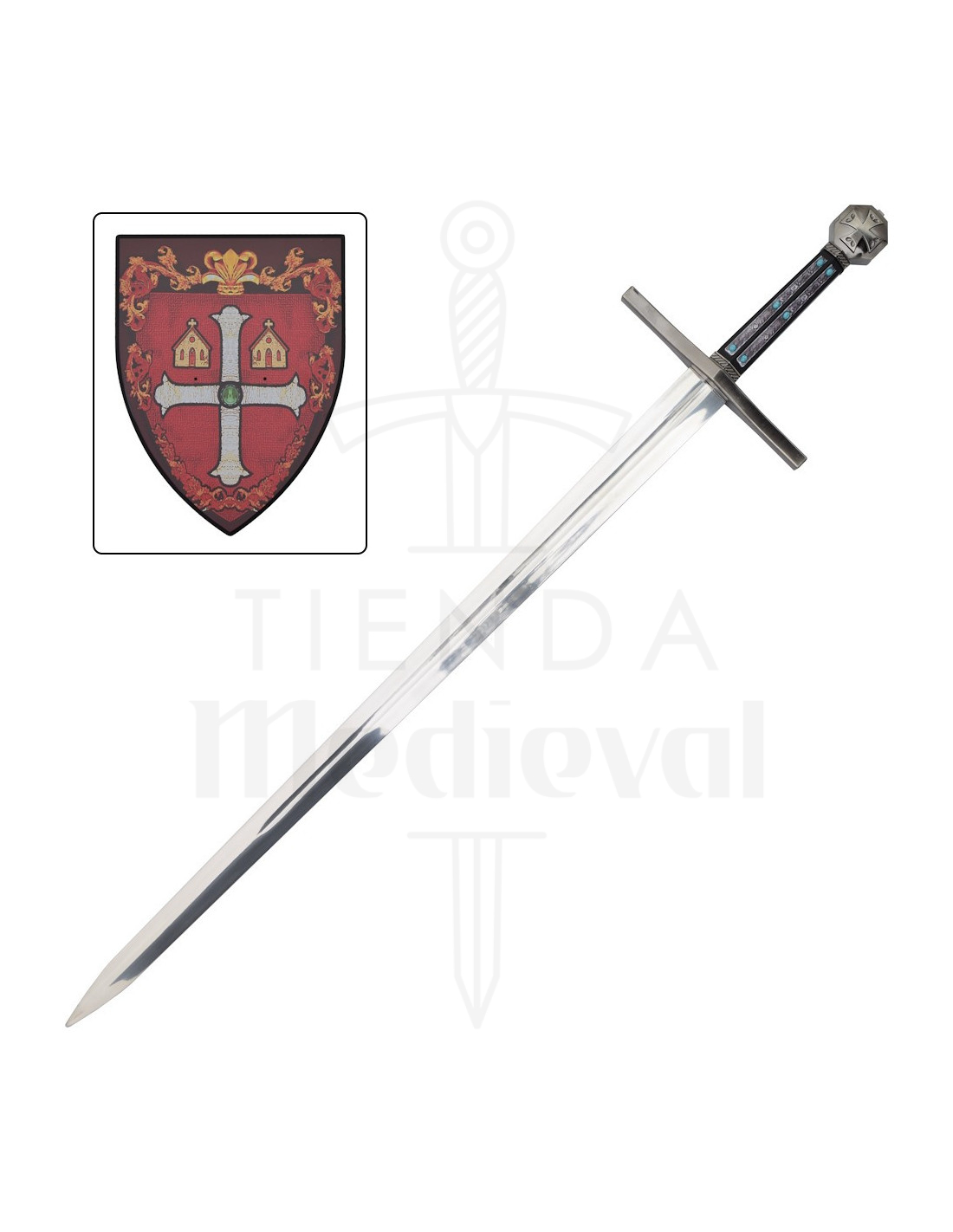 Include un supporto da parete in legno che facilita l'esposizione come pezzo centrale, mantenendola sicura e sempre pronta per essere ammirata. Il set è inoltre accompagnato da uno scudo decorativo con sfondo rosso scuro e dettagli in bianco, oro e verde, che crea un'ambientazione classica e coerente per chi desidera ricreare una scena ispirata a storie medievali.