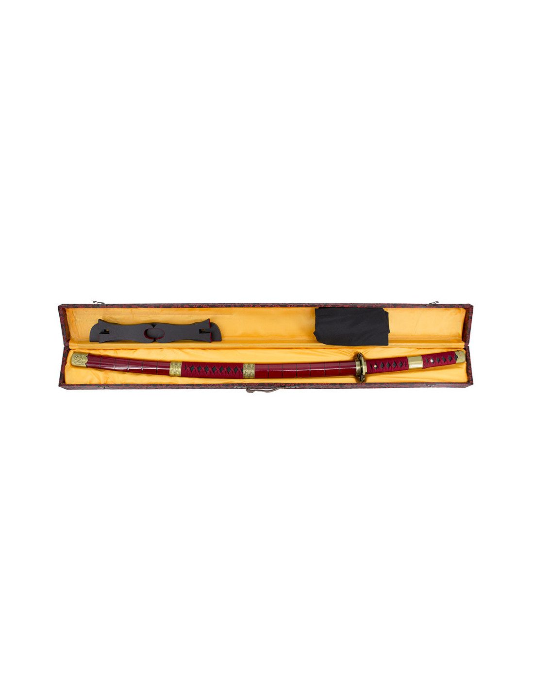 La katana include un elegante supporto in legno e velluto per esporla con orgoglio, oltre a una fondina e una scatola di presentazione che proteggono e mostrano la spada in modo sicuro.