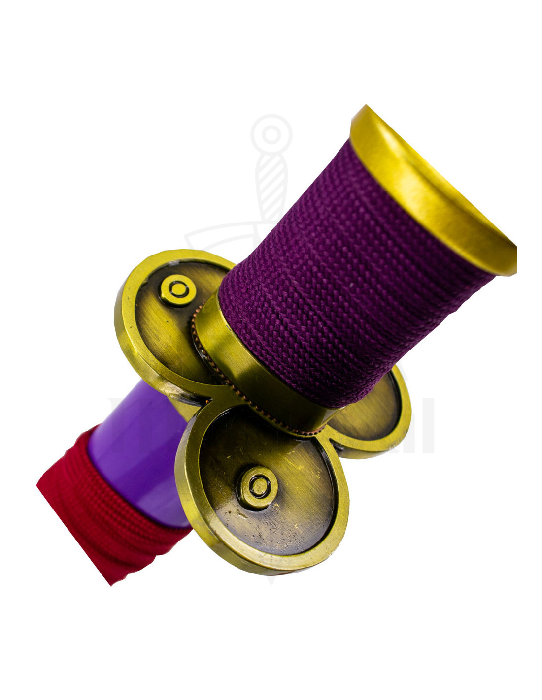 Il manico della katana è avvolto in corda viola e decorato con dettagli dorati, offrendo una presa sicura e comoda, oltre a un aspetto visivo accattivante che rafforza la sua autenticità. La custodia, coordinata in colore viola con dettagli dorati e legatura rossa, completa il design, facendo di questa katana un'opera d'arte sia funzionale che estetica.