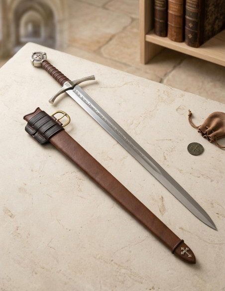 Con la sua lama in acciaio al carbonio 1065, questa spada è forgiata per resistere a qualsiasi sfida, offrendoti un'esperienza di impugnatura perfetta: equilibrio, velocità e precisione. Il suo design non è solo bello, ma diventa un'estensione della tua volontà, permettendoti di mostrare forza e controllo in ogni movimento. La scabbia in cuoio resistente e il cinturino d'epoca offrono un trasporto senza problemi, mentre il pomo con moneta templare e il manico rivestito in cuoio rosso confermano l'autenticità e il carattere aristocratico del Cavaliere Templare. Questa pièce, chiamata Accolade, è il tuo passaporto per la storia, il tuo simbolo di autorità in un mondo dove solo i forti rimangono.