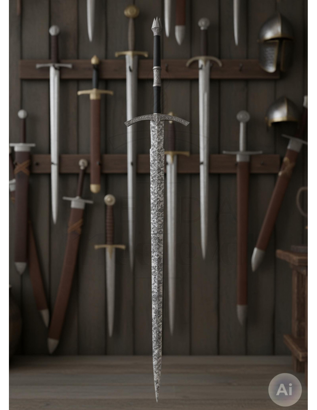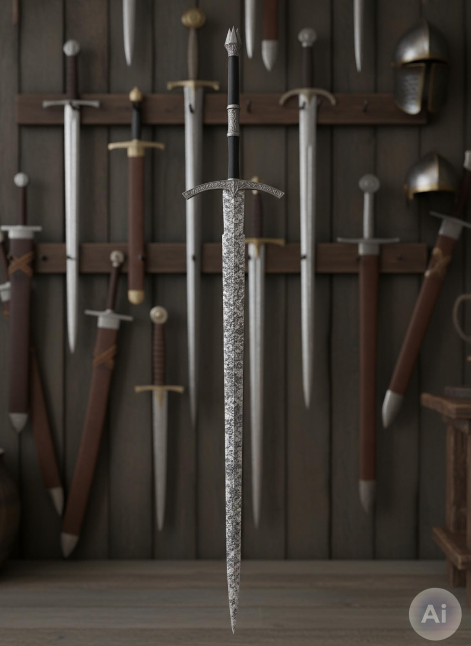 Il rivestimento in metallo nichelato sulla guardia e sul pomo aggiunge un tocco brillante e resistente, mentre la impugnatura in polipelle nera offre una presa comoda e visivamente elegante. Essendo completamente decorativa, il suo peso di 1927 grammi garantisce una presenza imponente senza essere scomoda da esporre sulla parete grazie al supporto incluso, che permette di appenderla con stile e di evidenziarla in qualsiasi spazio.