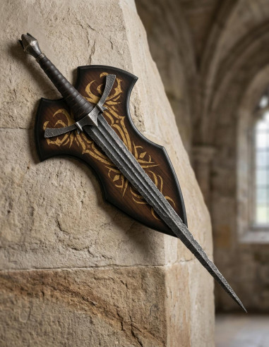 Vuoi mostrare il carattere imponente del Re Nero senza uscire di casa? Questa spada decorativa ispirata a Il Signore degli Anelli ti trasporta direttamente nell'universo della Terra di Mezzo, con un design che combina misticismo e potere. I suoi 137 cm di lunghezza totale la rendono perfetta per esporla nella tua collezione, con una lama di 100 cm che sembra di acciaio invecchiato, ottenendo un effetto usurato e autentico che ne esalta l'aspetto di antichità.