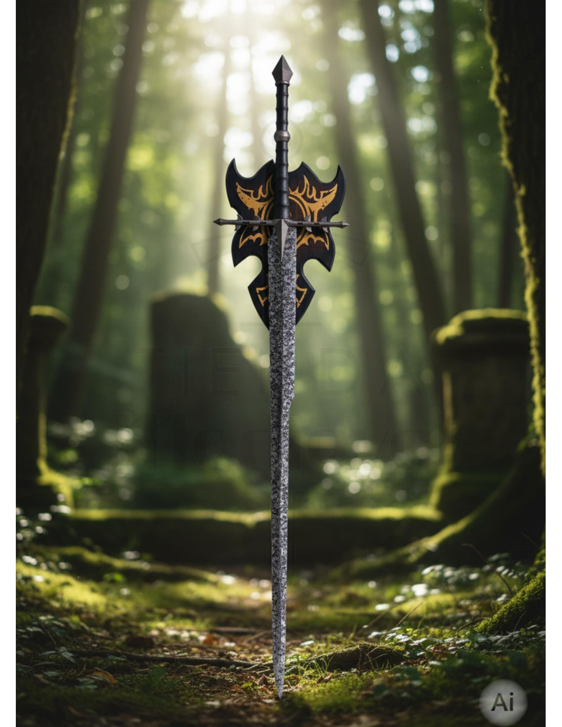 La lama, realizzata in acciaio con finitura invecchiata e filo consumato, combina resistenza ed estetica, ottenendo un effetto di antichità che conquisterà collezionisti e appassionati. La guardia e il pomo in nichel metallico offrono un contrasto elegante, mentre la impugnatura nera garantisce un aspetto robusto e una presa comoda per esporla alla parete grazie al supporto incluso. Inoltre, con un peso di 1600 grammi, risulta stabile ma leggera per la sua dimensione, facilitando il suo utilizzo visivo o cerimoniale.