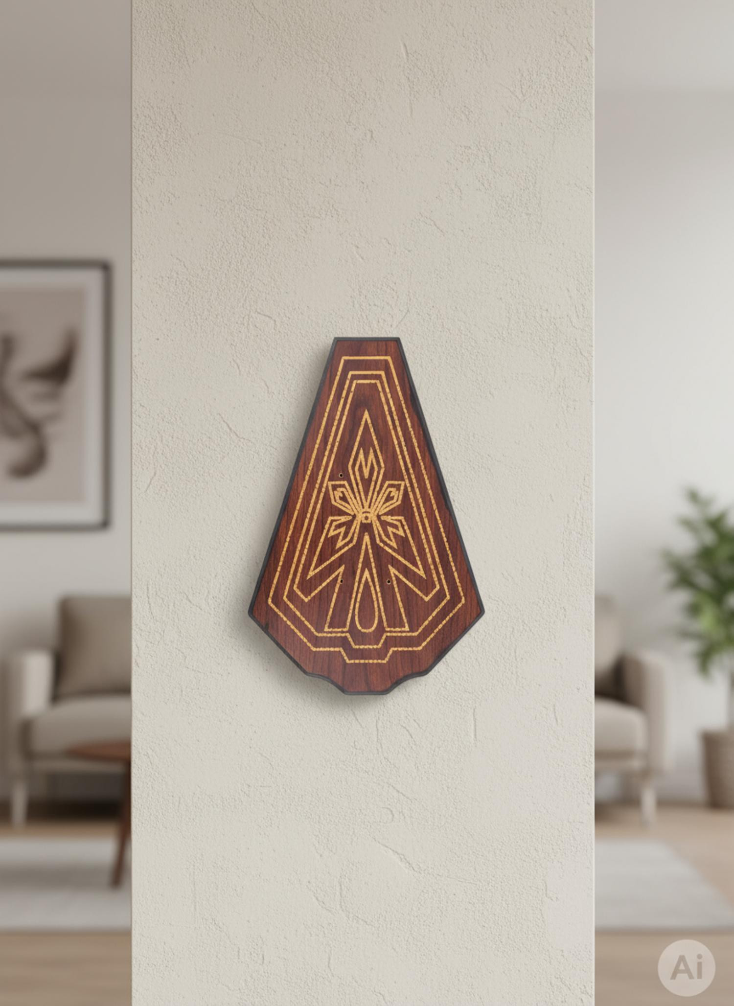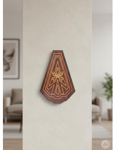 Il manico in legno rivestito con pelle sintetica nera intrecciata, decorato con ornamenti in metallo, non solo conferisce un aspetto elegante e resistente, ma anche una sensazione di maggiore realismo e comfort visivo. La base o supporto, ispirato a uno scudo con colori marrone e dorato, facilita la sua esposizione negli spazi e mantiene il pezzo sicuro e in perfette condizioni.