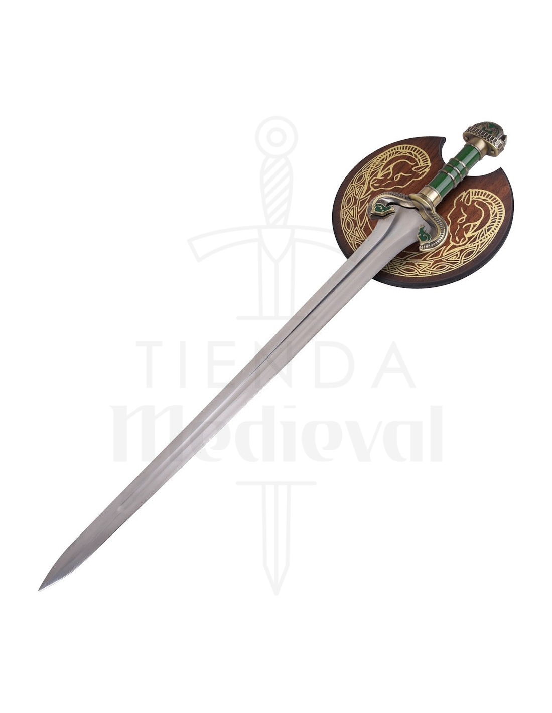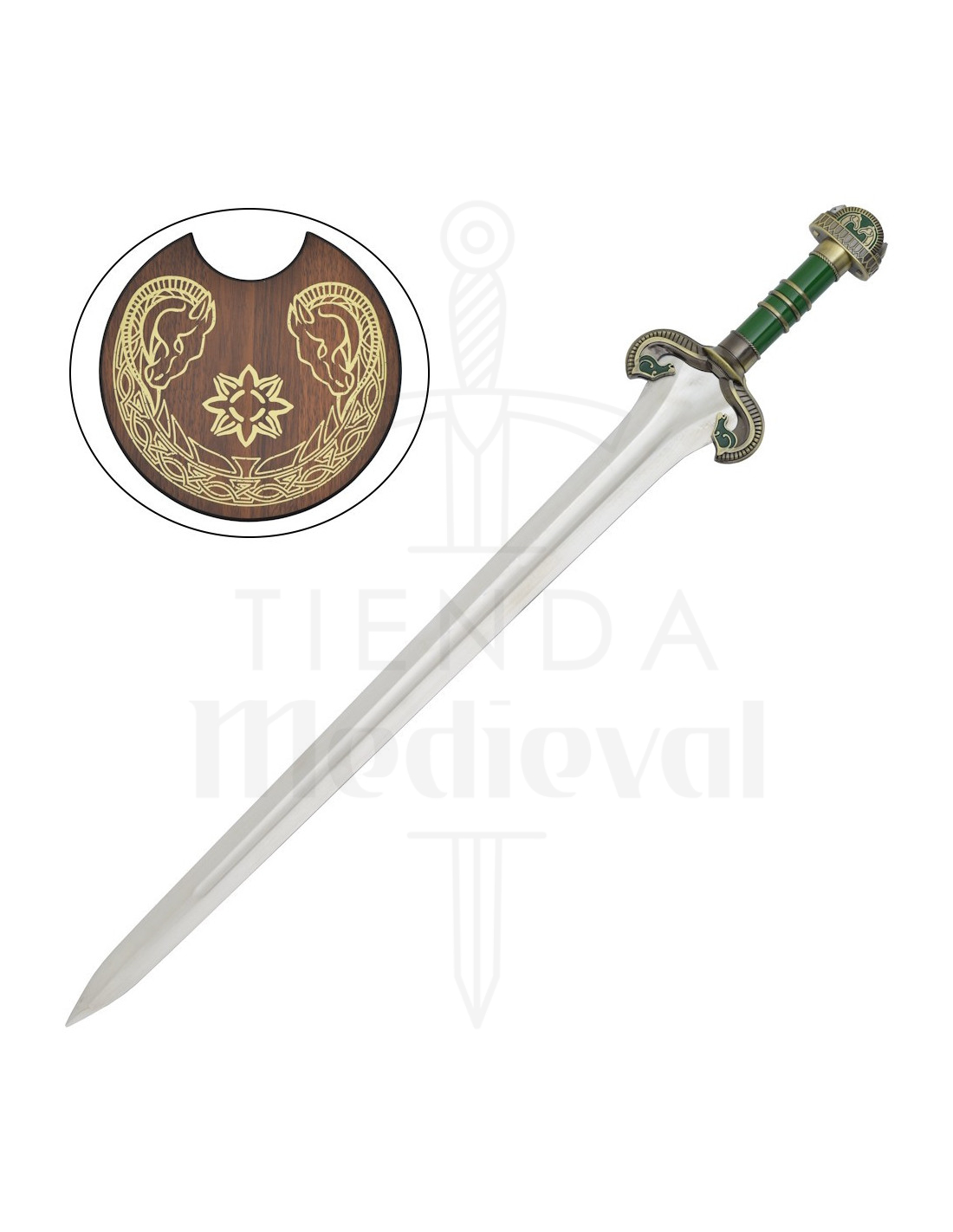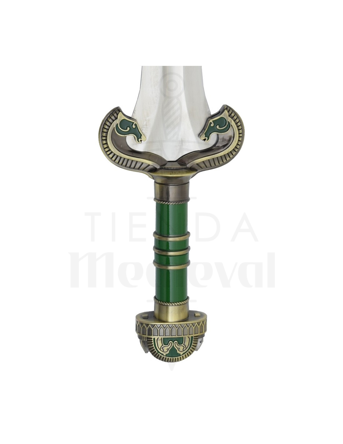 Questa riproduzione rende omaggio a un momento eroico, offrendo una lama metallica lucida a doppio taglio che riflette la luce con carattere, e una scanalatura centrale che rafforza il suo aspetto autentico e conferisce una sensazione di equilibrio quando viene esposta. L'impugnatura, di colore verde con dettagli metallici dorati, offre un contrasto raffinato che rende il pezzo un punto focale, mentre la guardia e il pomo arrotondato, decorati con motivi stilizzati, trasmettono un'estetica curata che evoca nobiltà e determinazione.