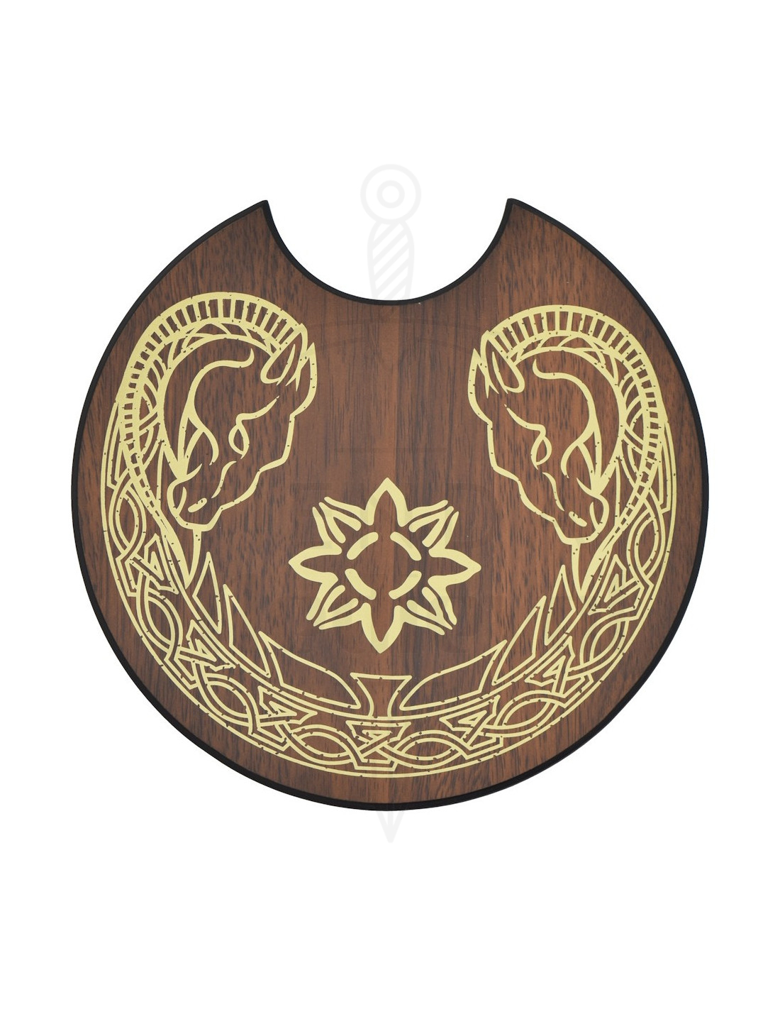 Il supporto incluso non è solo un accessorio, è parte del tutto: legno scuro con una finitura fine e decorazioni dorate, due teste affrontate e un motivo centrale a forma di stella o fiore, che sostiene il pezzo in verticale e lo trasforma in un elemento decorativo d'impatto. Posizionare la spada sul supporto è semplice, e il tutto guadagna presenza senza richiedere un montaggio complesso.