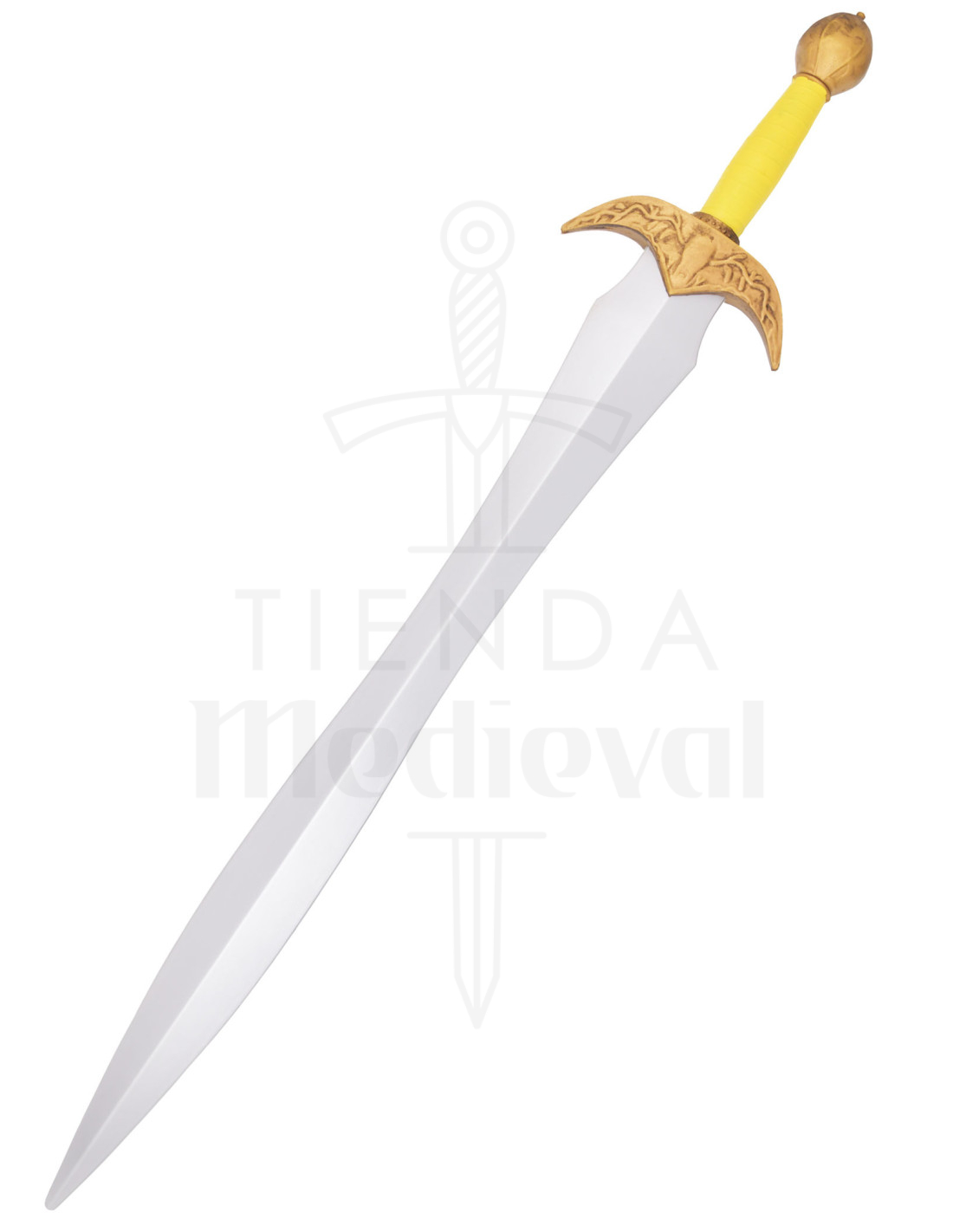 La Aelinor si distingue per la sua estetica curata e il suo equilibrio pensato per il combattimento ricreativo e lo spettacolo, consentendo movimenti fluidi senza rinunciare a un aspetto imponente. La sua lama con finitura argentata e nervo centrale dona brillantezza e una linea che cattura l’attenzione ad ogni scontro, mentre la guardia ornata in oro aggiunge l’aria eroica che cerchi per il tuo ruolo.